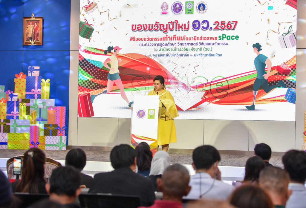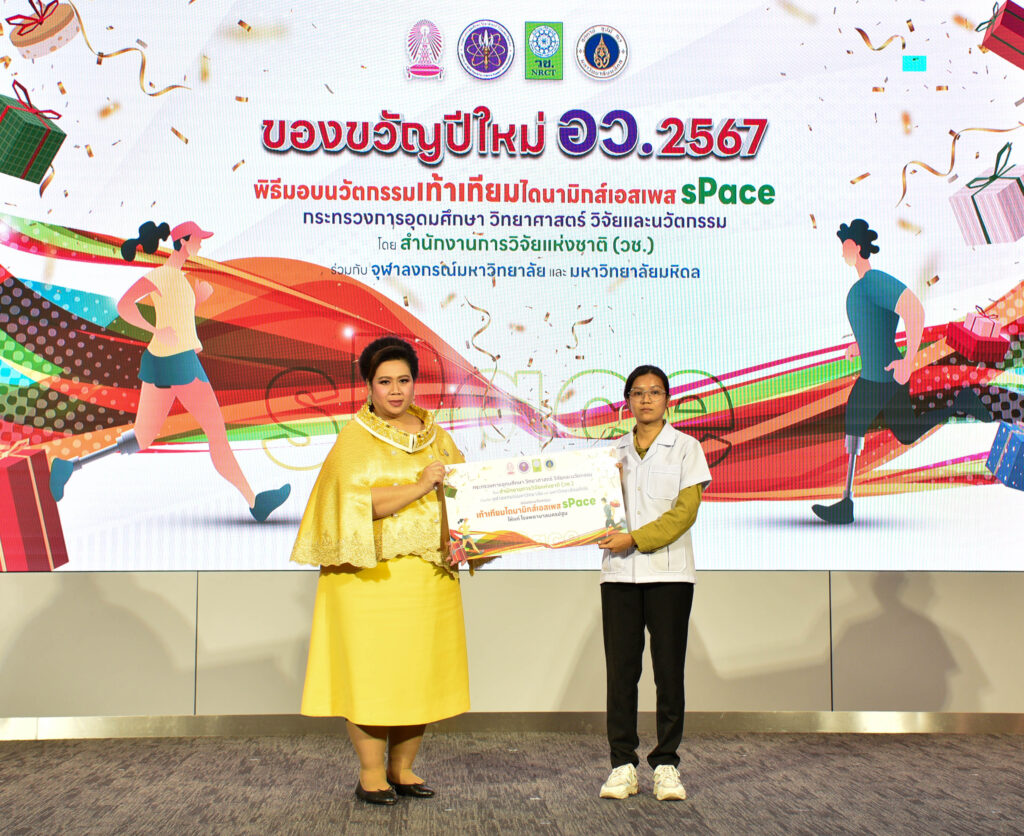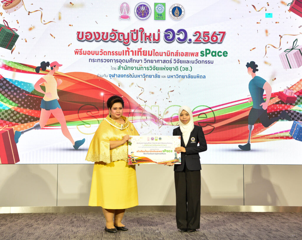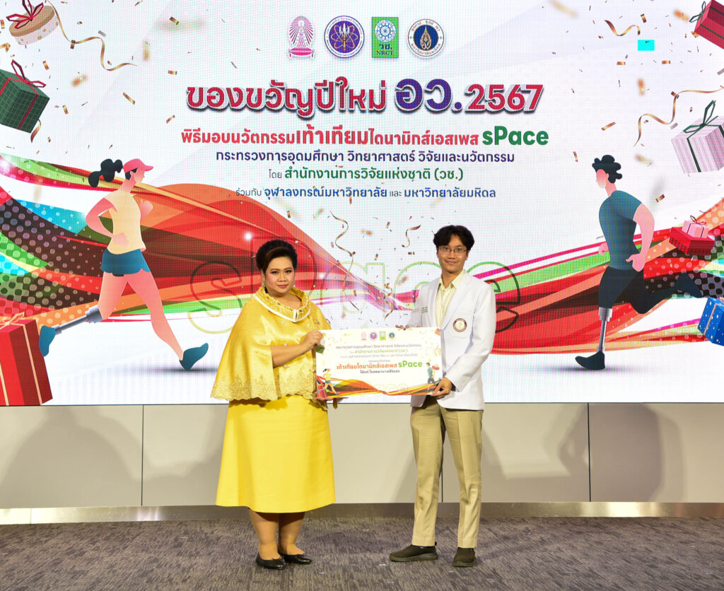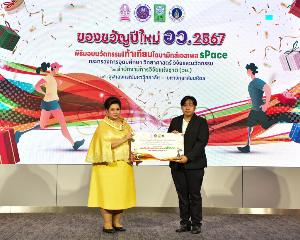 เมื่อวันที่ 3 เมษายน 2567 กระทรวงการอุดมศึกษา วิทยาศาสตร์ วิจัยและนวัตกรรม โดย สำนักงานการวิจัยแห่งชาติ (วช.) ร่วมกับ จุฬาลงกรณ์มหาวิทยาลัย และมหาวิทยาลัยมหิดล จัดพิธีส่งมอบนวัตกรรมเท้าเทียมไดนามิกส์เอสเพส (sPace) คุณภาพสูง เพื่อพัฒนาคุณภาพชีวิตผู้พิการ ให้กับ โรงพยาบาล ทั้ง 7 แห่ง ภายใต้โครงการของขวัญปีใหม่ 2567 จาก กระทรวง (อว.) ภายใต้การสนับสนุนทุนวิจัย จาก (วช.)