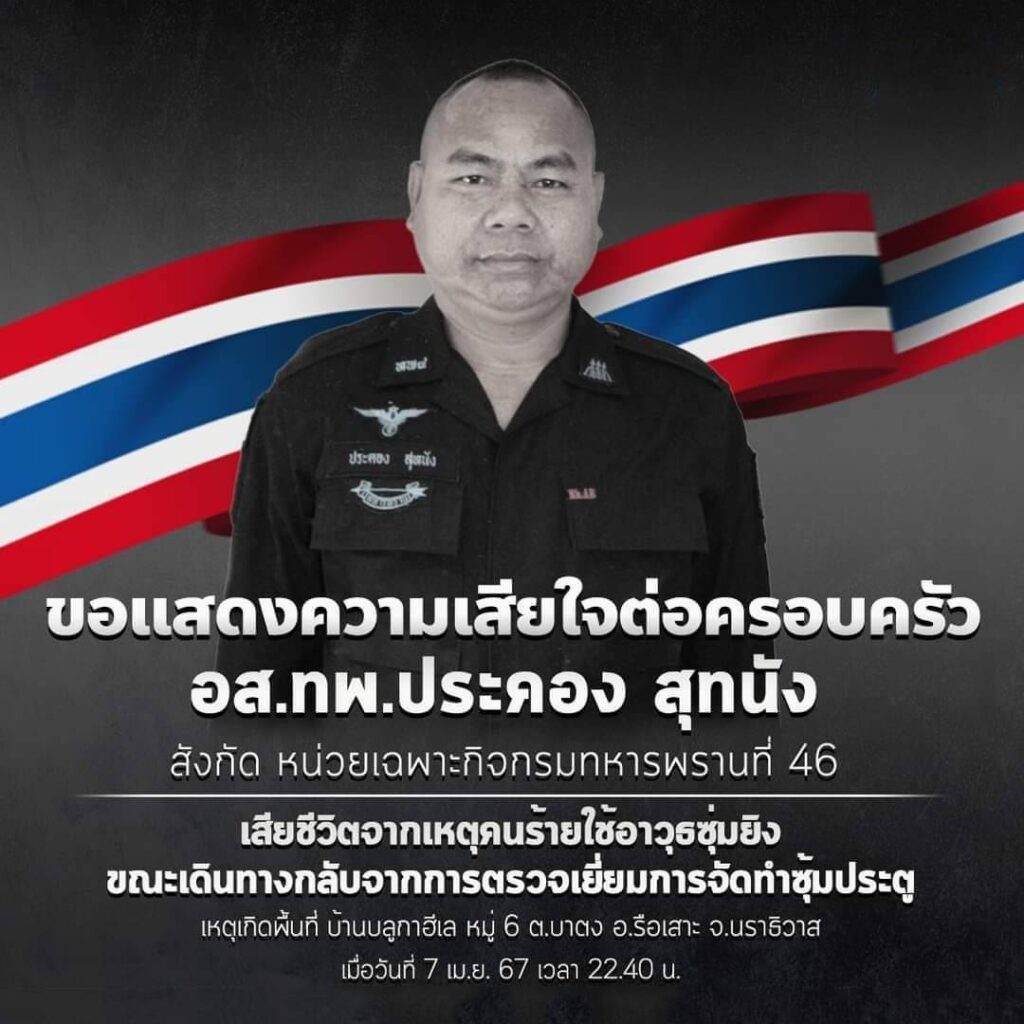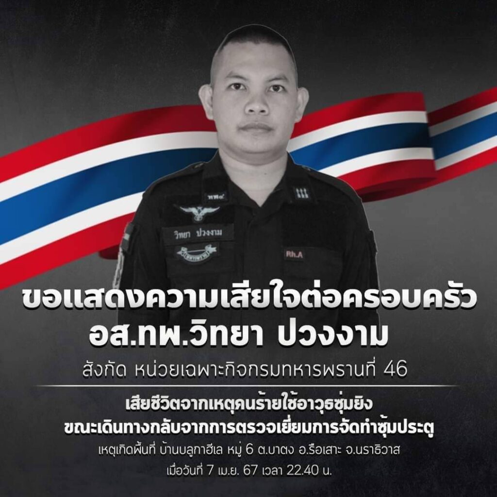 ให้เกียรติร่วมพิธีรพน้ำศพ เคารพศพ และมอบเงินช่วยเหลือแก่ ผู้แทนครอบครัว อส.ทพ.วิทยา ปวงงาม และ อส.ทพ.ประคอง สุทนัง สังกัด หน่วยเฉพาะกิจกรมทหารพรานที่ 46 ซึ่งทั้ง 2 นายเสียชีวิตจากเหตุคนร้ายลอบยิง บริเวณถนนบ้านบลูกาฮีเล ม.6 ต.บาตง อ.รือเสาะ จ.นราธิวาส เมื่อวันที่ 7 เม.ย.2567 เวลา 23.15 น. ที่ผ่านมา