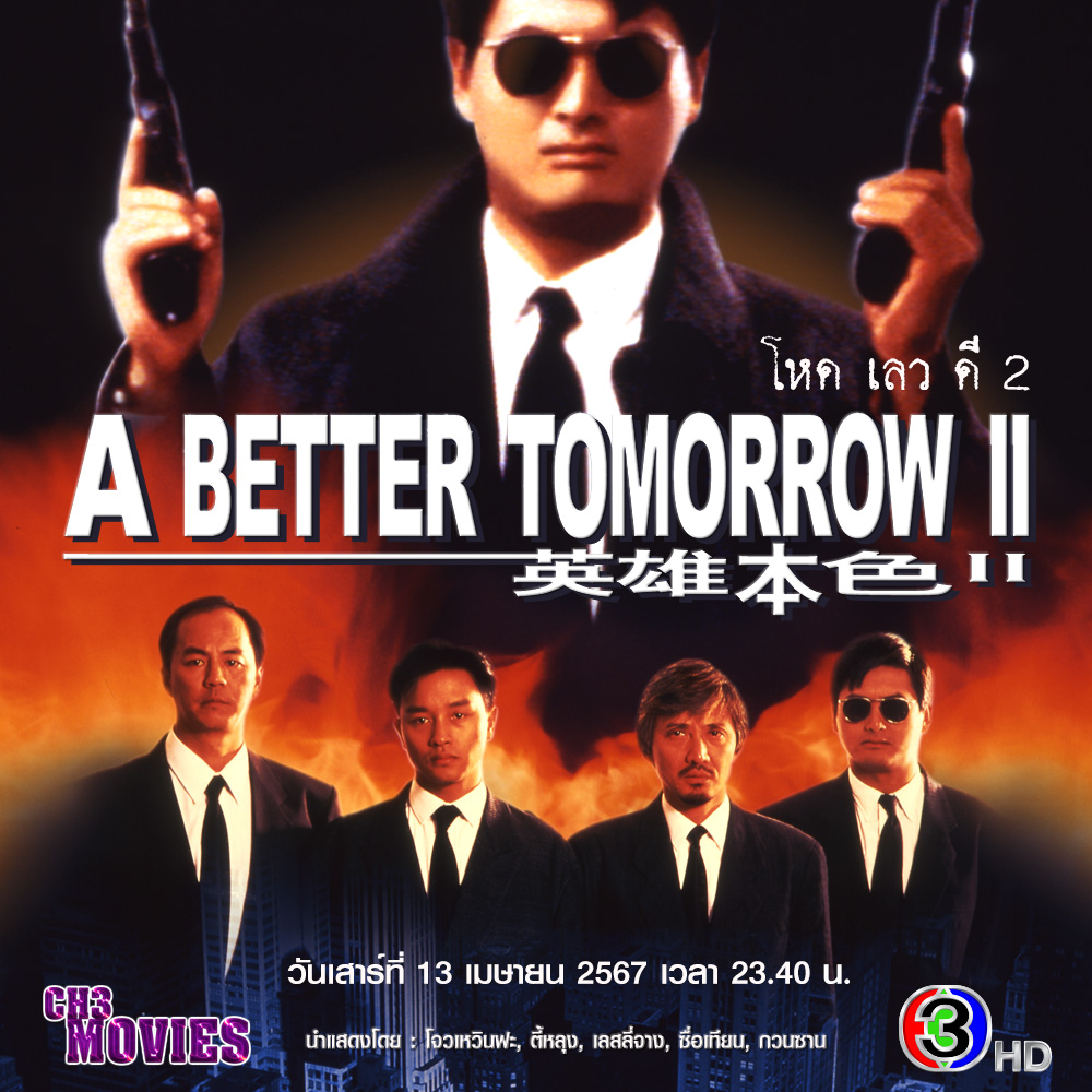“แชนแนลทรีมูฟวี่ส์” เสนอภาพยนตร์ “โหด เลว ดี 2 : A Better Tomorrow II ” นำแสดงโดย : โจวเหวินฟะ, เลสลี่ จาง, ตี้หลุง เมื่อเพื่อนสนิท อาเห่า ที่ชื่อว่า เสี่ยวหม่า ยังมีน้องชายอีกคนที่หน้าตาเหมือนกันชื่อ เคน เปิดร้านอาหารอยู่ที่นิวยอร์ก เคน เป็นคนใจถึงไม่เกรงกลัวใครเหมือนพี่ชาย ขณะที่ ลุงหลง อดีตมาเฟียที่พวกอาเห่าให้การนับถือ ต้องการตามหาลูกสาวที่พลัดพราก เลยไปขอความช่วยเหลือจาก คุณโก หารู้ไม่คุณโกได้หักหลังลุงหลง และยังส่งคนมาตามเก็บลุงหลงและเคน และแล้วเคน ลุงหลง อาเห่าและอาเฉีย ร่วมมือกันเพื่อไปทะลายองค์กรคุณโกแต่อาเฉียพลาดท่าถูกยิงตาย ทั้ง 3 จึงสาบานว่าจะล้างแค้นให้อาเฉีย ด้วยการบุกเข้าไปยิงแบบบ้าระห่ำ ติดตามได้ใน “แชนแนลทรีมูฟวี่ส์” “โหด เลว ดี 2 : A Better Tomorrow II ” เวลา 23.40 น.