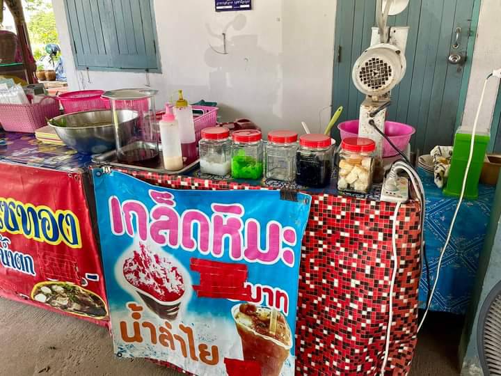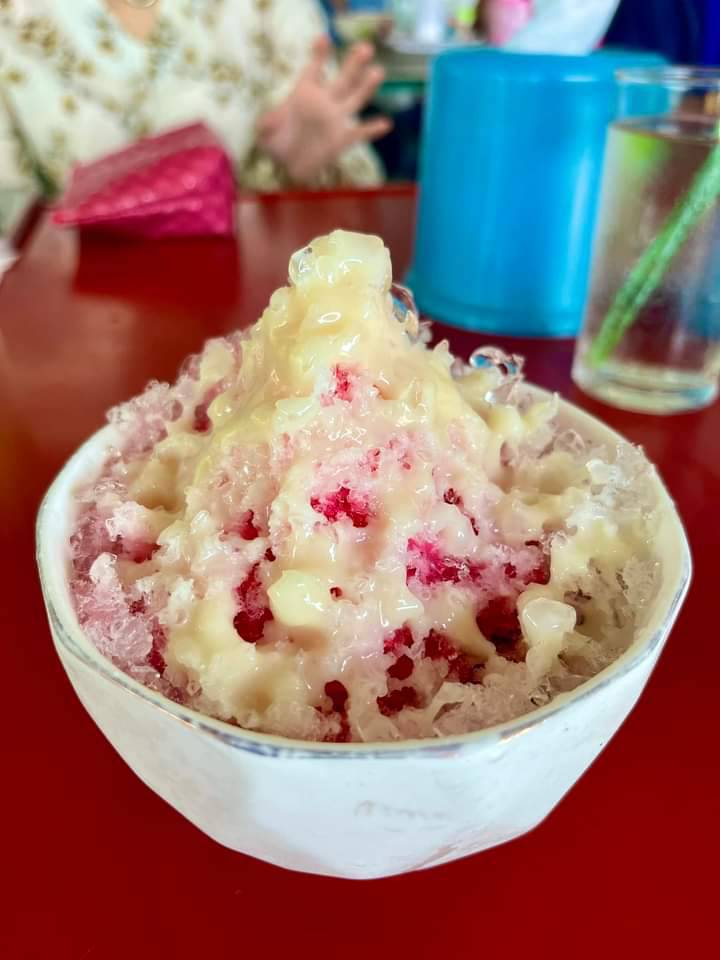 หมูหมักนุ่ม หมูตุ๋นเปื่อย มาพร้อมกับน้ำแข็งไสหวานๆ เย็นๆ และที่ร้านยังมีน้ำใบเตยหอมๆ