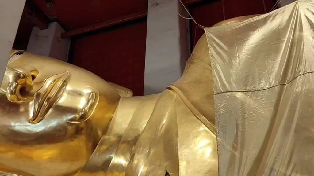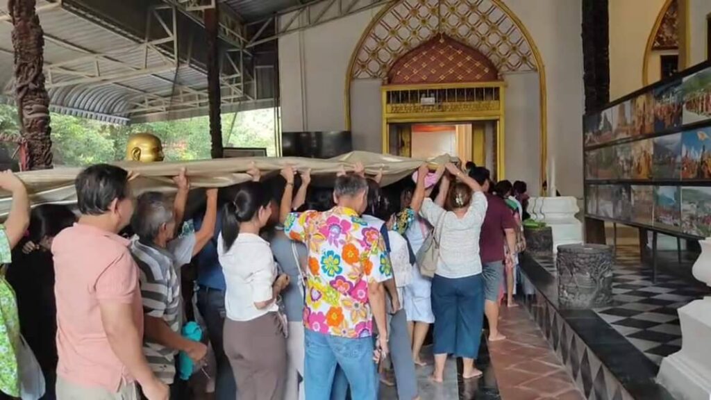 เวลา ๑๔.๓๐ น.ประกอบพิธีเย็บต่อกันเป็นผืนใหญ่ แล้วช่วยกันนำผ้าห่ม ยาว ๓๐ เมตร สูง ๑๑ เมตร ซึ่งมีนางฟ้าทำพิธีเย็บผ้าติดต่อกัน พระภิกษุสงฆ์พระสังฆาธิการสวดพระพุทธมนต์ แล้วนำไปคลุมองค์พระนอนจักรสีห์ พระพุทธรูปปางไสยาสน์ที่เก่าแก่ มีขนาดองค์พระยาวถึง ๔๗.๔๐ เมตร แทนผ้าห่มผืนเก่าที่ทางวัดนำ มาตัดแบ่งให้ผู้เข้าร่วมพิธีทุกคนนำไปบูชา เป็นสิริมงคลกั้บชีวิตในวันสงกรานต์ หรือวันขึ้นปีใหม่ไทย
