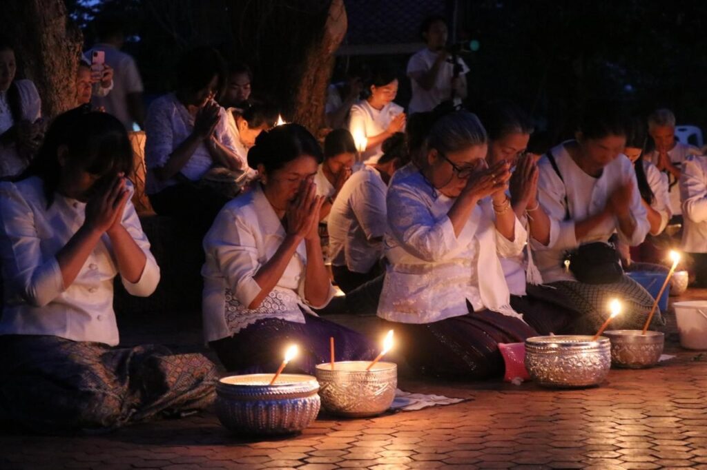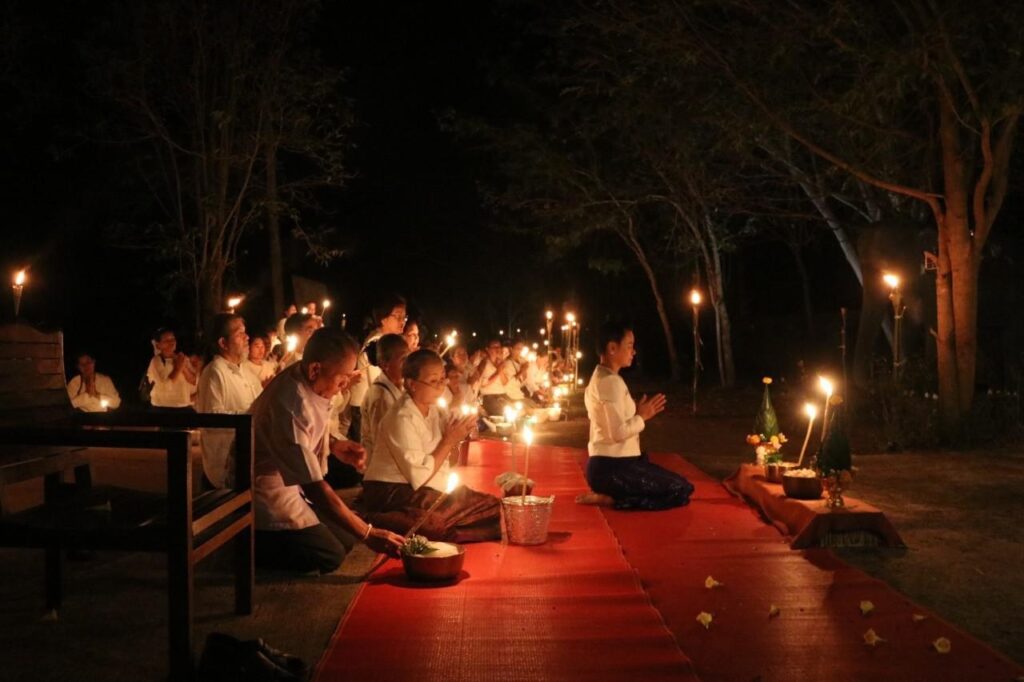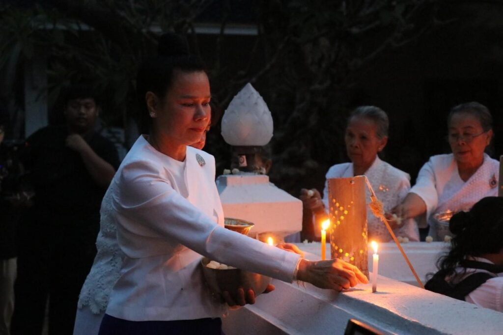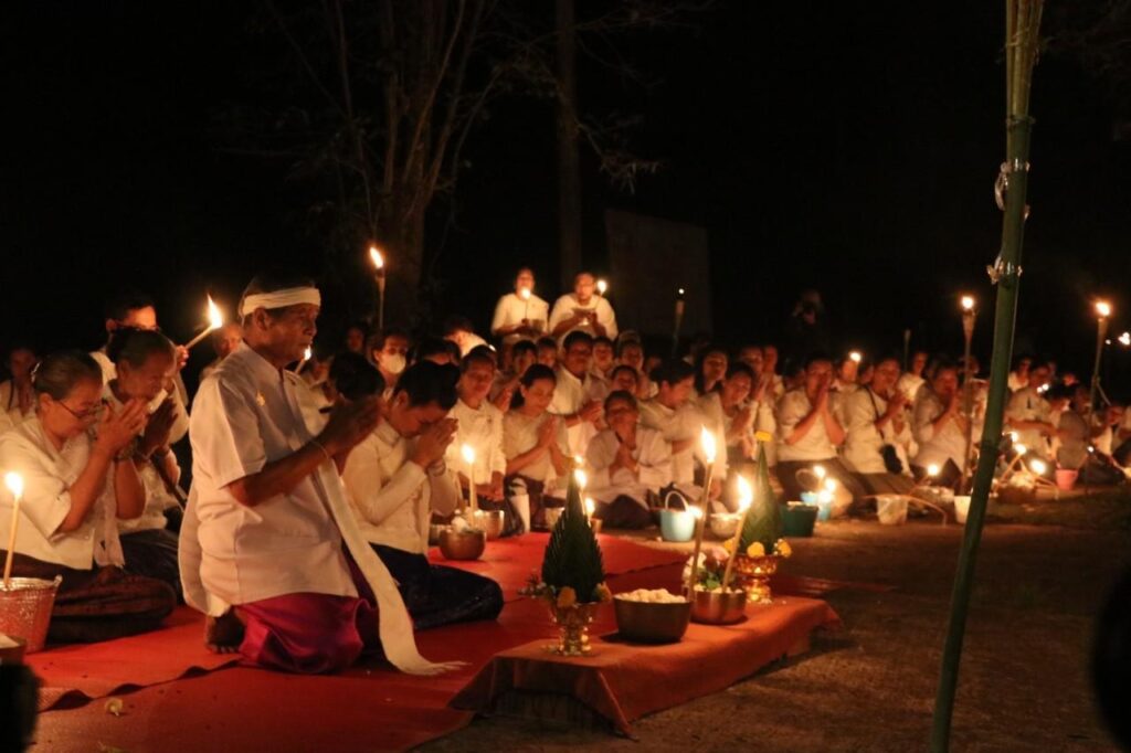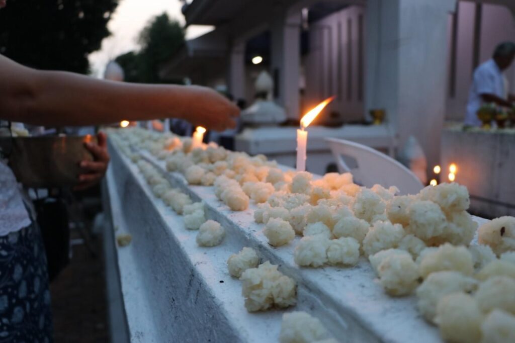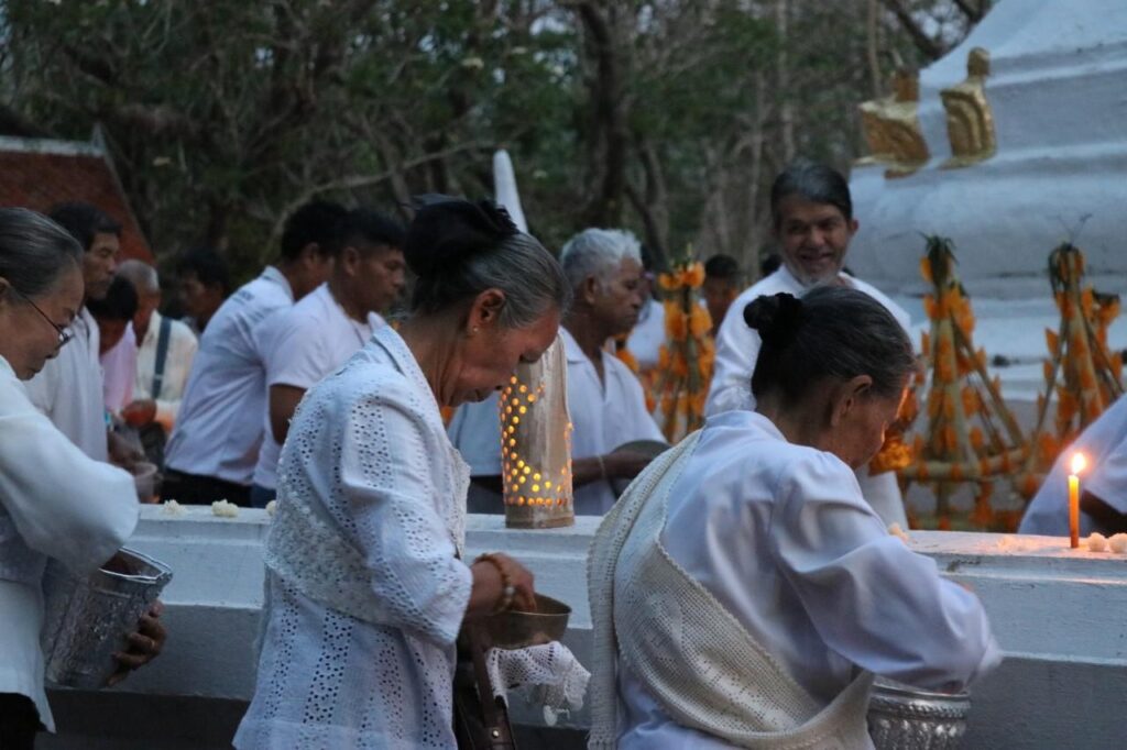 เมื่อถึงองค์พระธาตุแล้ว เจ้าพ่อกวนและคณะ ทำพิธีบูชาคารวะธาตุ ชาวบ้านลูกผึ้งลูกเทียนต่างนำข้าวเหนียวที่ปั้นเป็นก้อน ขนาดพอดีคำ คนละ 10 เป็น 100 และเพิ่มพูนเป็น 1,000 ผู้ชายถวายด้านในองค์พระธาตุ ส่วนผู้หญิงวางรอบ ๆ กำแพงแก้วขององค์พระธาตุ จึงเป็นที่มาของประเพณีนี้ ว่า “แห่ข้าวพันก้อน” ถวายแด่องค์พระธาตุศรีสองรัก และพระนาคปรกกายสิทธิ์ รวมถึง สิ่งศักดิ์สิทธิ์ที่ปกปักรักษาเมืองด่านซ้าย พร้อมกับรับพรสร้างพลังแก่ชีวิตและจิตใจให้มีความสุข ความสำเร็จในวันเริ่มต้นศกศักราชปีใหม่ตลอดปีและตลอดไป นอกจากนี้ ยังเป็นการสร้างความรักความสามัคคีของคนในชุมชน โดยใช้กิจกรรมทางประเพณีวัฒนธรรมเป็นสื่อกลาง