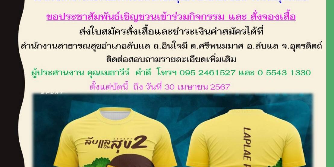ส่งใบสมัครสั่งเสื้อและชำระเงินค่าสมัครได้ที่ สำนักงานสาธารณสุขอำเภอลับแล ถ.อินใจมี ต.ศรีพนมมาศ อ.ลับแล จ.อุตรดิตถ์ ติดต่อสอบถามรายละเอียดเพิ่มเติม
