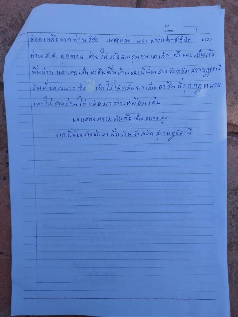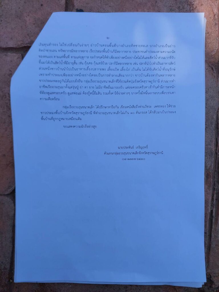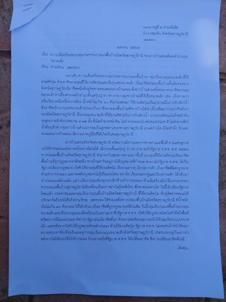 วันนี้ได้เปลี่ยนรัฐบาลใหม่แล้ว ประชาชนและกลุ่มเรืออวนรุ่นพื้นบ้านจังหวัดสุราษฎร์ธานี ที่ใช้อวนติดปุ่ม ที่อยู่ติดชายทะเลได้ จึงปรึกษากันยื่นหนังสือถึง นายวัชระ เพชรทอง ให้ช่วยเหลือชาวประมงพื้นบ้านจังหวัดสุราษฎร์ธานี ที่น้ำหนักเรือไม่เกิน 10 ตันกรอส ให้ได้กลับมาเป็นอาชีพที่ถูกกฎหมายเหมือนเดิม