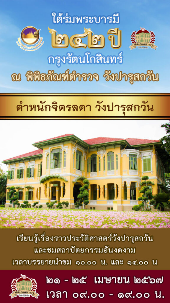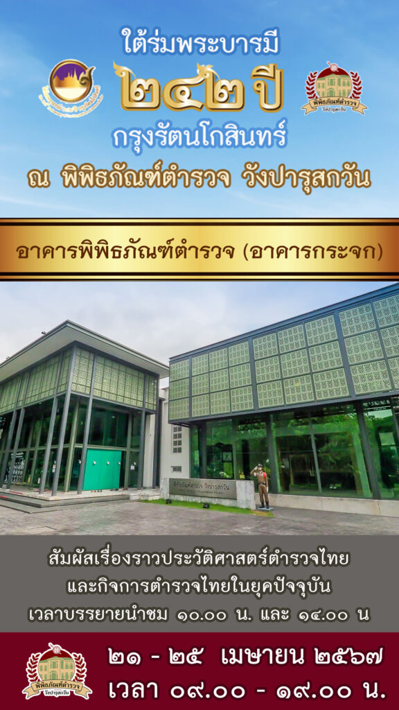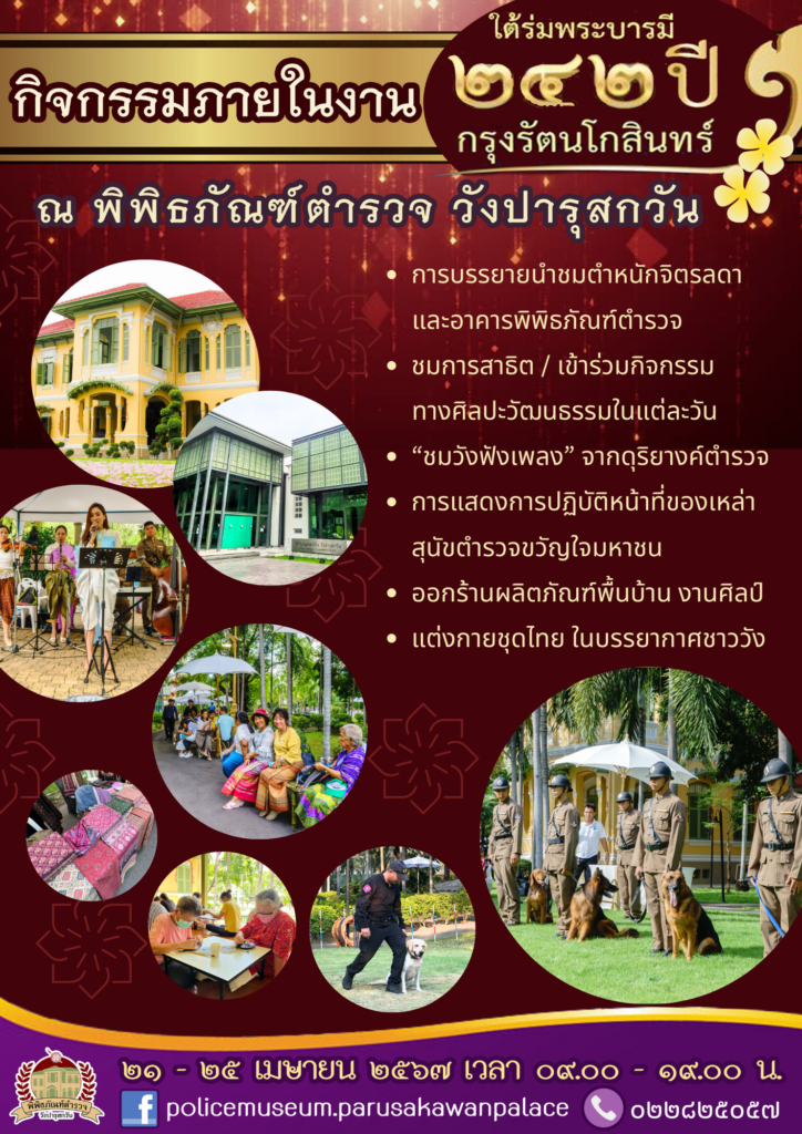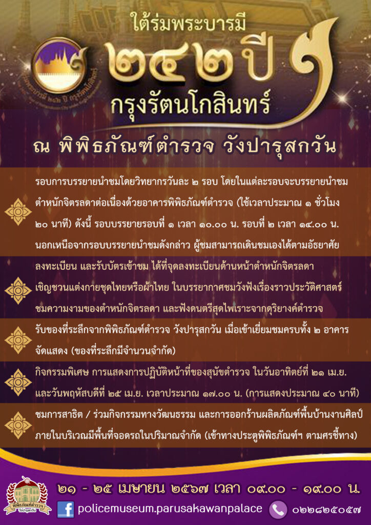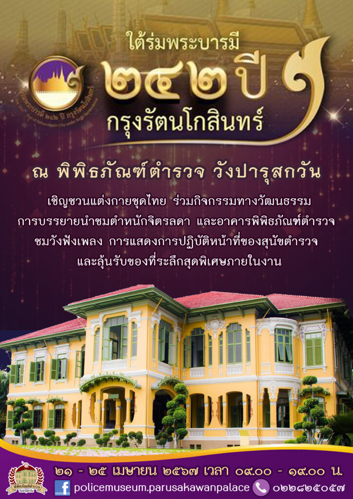 พิพิธภัณฑ์ตำรวจ สำนักงานตำรวจแห่งชาติ เป็น 1 ในพิพิธภัณฑ์รอบเกาะรัตนโกสินทร์ เข้าร่วมกิจกรรมในงาน “ใต้ร่มพระบารมี 242 ปี กรุงรัตนโกสินทร์” เชิญชวนพี่น้องประชาชนเยี่ยมชมพิพิธภัณฑ์ตำรวจ วังปารุสกวัน ระหว่างวันที่ 21-25 เมษายนนี้ ตั้งแต่เวลา 09.00-19.00 น.