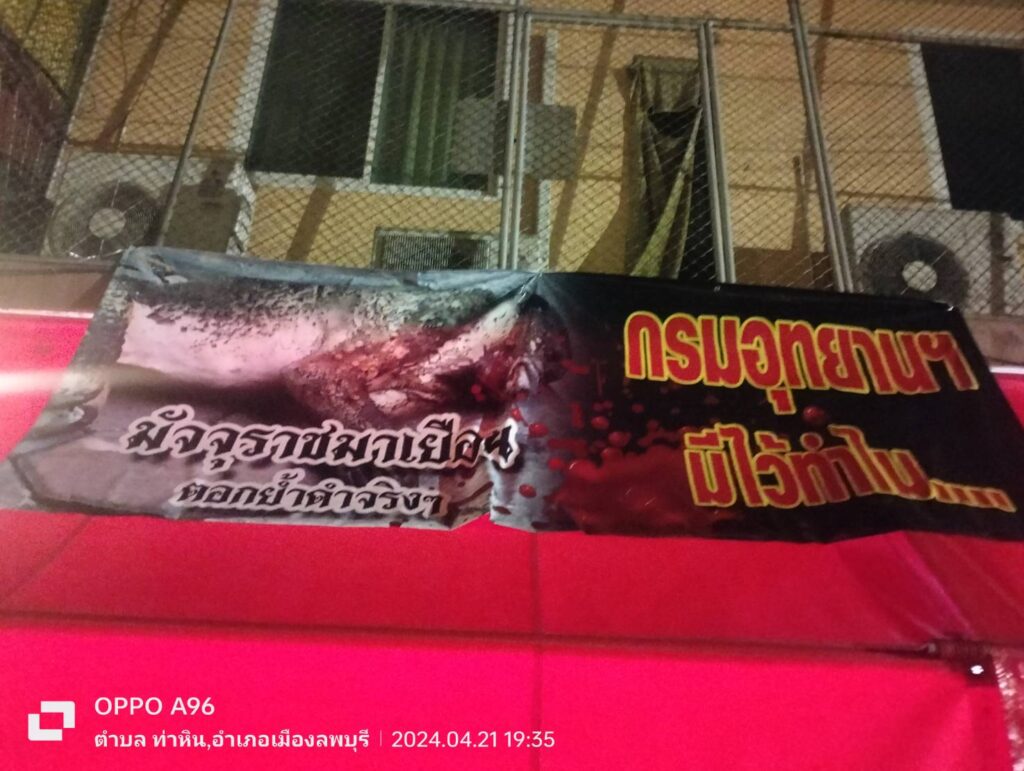 ผู้สื่อข่าวได้ลงพื้นที่ ไปที่พระปรางค์แขก ตำบลท่าหิน อำเภอเมือง จังหวัดลพบุรี ไปที่หน้าห้างประตูทอง ได้ติดป้ายประท้วงขับไล่กรมอุทยานฯ