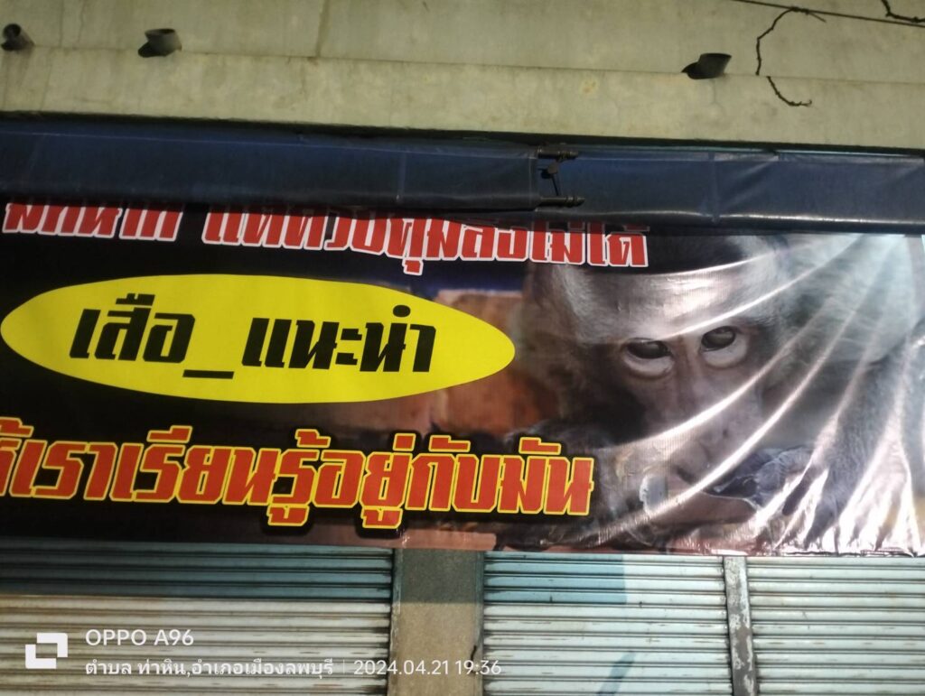 และผมจะนัดมวลชน มารวมกันช่วงเวลาตี 3 ในวันที่ 22 เมษายน 2567 เพื่อทำการติดป้ายเพิ่ม หลังจากที่มีติดไปบางส่วนแล้วได้มีบรรดาลิงเข้าไปรื้อป้าย อยู่ที่หน้าร้านเป็นจำนวนมาก ทำให้เสียหาย