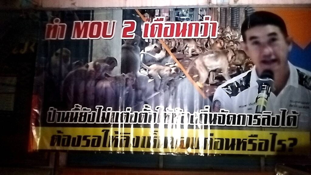 ประชาชนชาวเมืองลพบุรี ได้ติดป้ายบริเวณหน้าร้านเป็นการประท้วงกรมอุทยานแห่งชาติที่เข้าข้างลิง โดยอธิบดีกล่าวหาว่าชาวลพบุรีรังแกลิง ซึ่งสร้างความไม่พอใจให้กับชาวลพบุรีโดยเฉพาะผู้ที่อาศัยทำมาหากินมีร้านรวงต่างๆภายในตัวเมืองลพบุรี