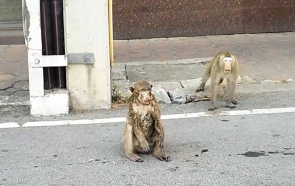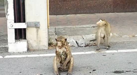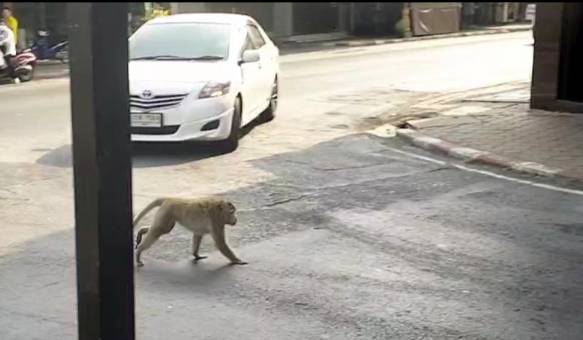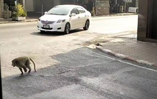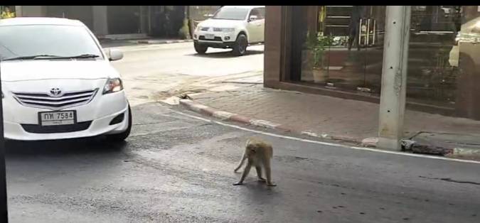 ลิงตัวหนึ่งในตลาดเมืองลพบุรี ได้วิ่งตัดหน้ารถยนต์สุดชีวิตไม่กลัวตาย