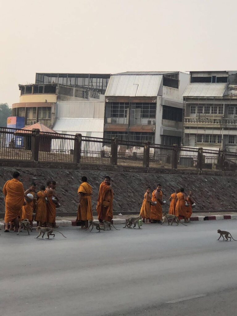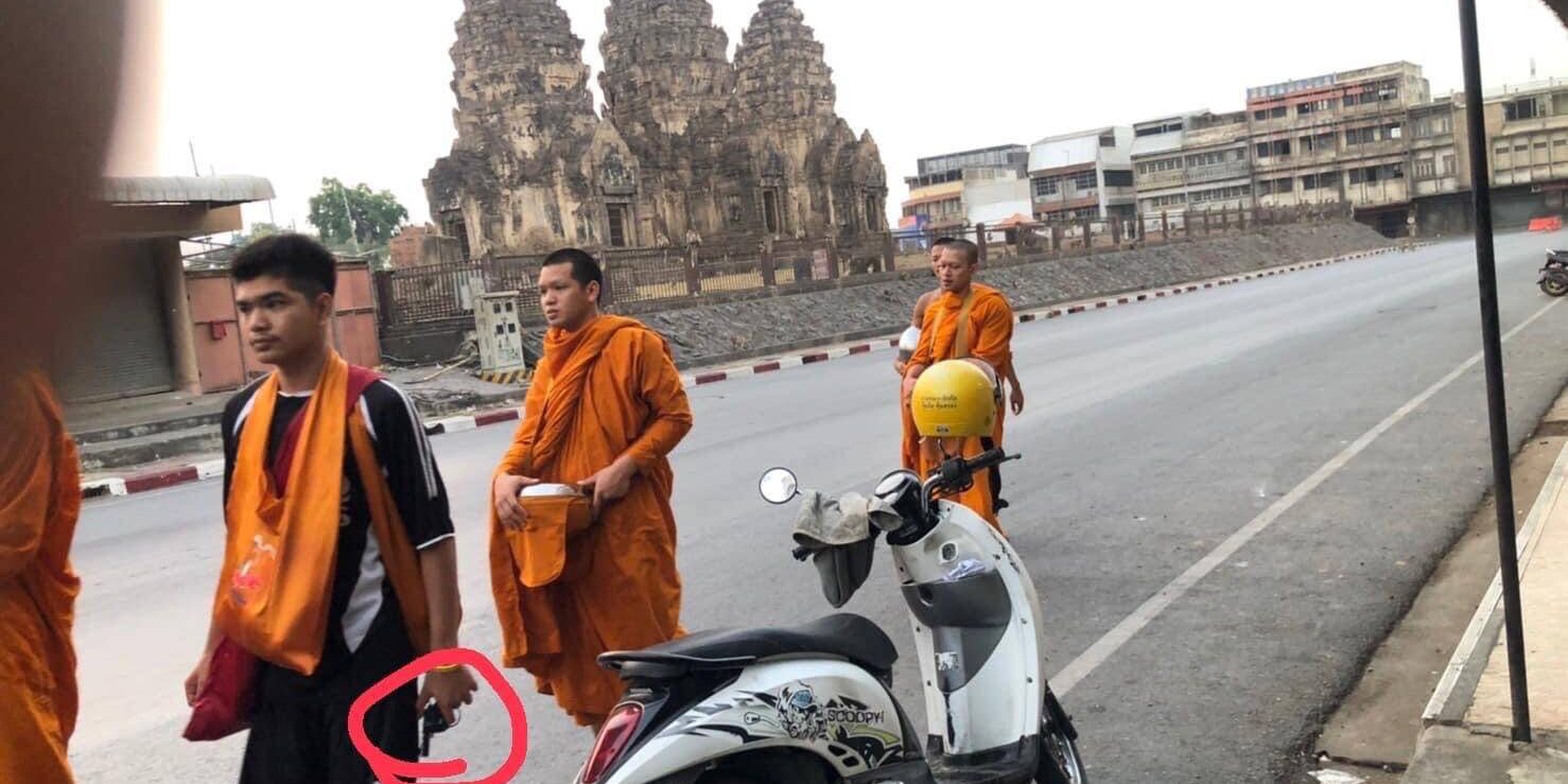 คลิปกล้องวงจรปิดร้านซ่อมมอเตอร์ไซค์ ช่วงเวลาก่อนเทศกาลสงกรานต์ที่ผ่านมาเป็นเวลาบิณฑบาตของพระวัดหนึ่ง โดยมีเณรที่บวชภาคฤดูร้อนร่วมบิณบาตด้วย ในระหว่างที่เดินบิณฑบาต ทเณรน้อยจะมีบาตรห้อยอยู่ ลิงจึงคิดว่ามีของกิน จึงได้กระโจนรุมแย่งทำให้เณรน้อยตกใจไปตามๆกัน หลังจากวันนั้นเณรน้อยไม่ร่วมเดินบิณบาตเส้นทางนี้อีกเลย ในขณะที่พระสงฆ์ได้มีวิธีป้องกันโดยให้เด็กวัดร่วมถือปืนอัดลมไว้ขู่ลิง เพื่อไม่ให้กระโจนแย่งอาหารอีก