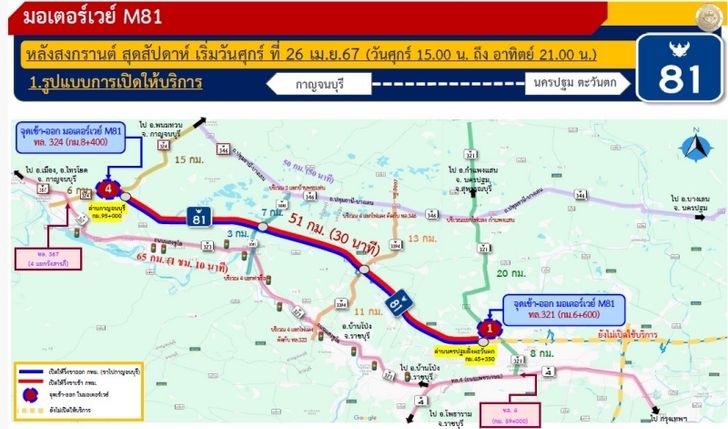 กรมทางหลวงเตรียมเปิดวิ่งฟรีชั่วคราว ทางหลวงพิเศษระหว่างเมืองหมายเลข 81 หรือ มอเตอร์เวย์ M81 สายบางใหญ่ – กาญจนบุรี ช่วงนครปฐมตะวันตก – กาญจนบุรี ระยะทาง 51 กิโลเมตร ทุกสุดสัปดาห์เฉพาะวันศุกร์ ตั้งแต่เวลา 15.00 น. ถึง วันอาทิตย์ เวลา 21.00 น. เริ่มตั้งแต่วันศุกร์ที่ 26 เมษายน 2567 เป็นต้นไป