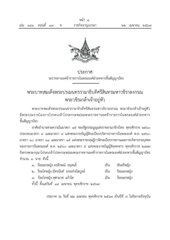 วันที่ 22 เม.ย.67 ราชกิจจานุเบกษา เผยแพร่ พระบรมราชโองการ ประกาศ พระราชทานยศข้าราชการในพระองค์ฝ่ายทหารชั้นสัญญาบัตร โดยระบุว่า พระบาทสมเด็จพระปรเมนทรรามาธิบดีศรีสินทรมหาวชิราลงกรณ พระวชิรเกล้าเจ้าอยู่หัว มีพระบรมราชโองการโปรดเกล้าฯ พระราชทานยศข้าราชการในพระองค์ฝ่ายทหารชั้นสัญญาบัตร