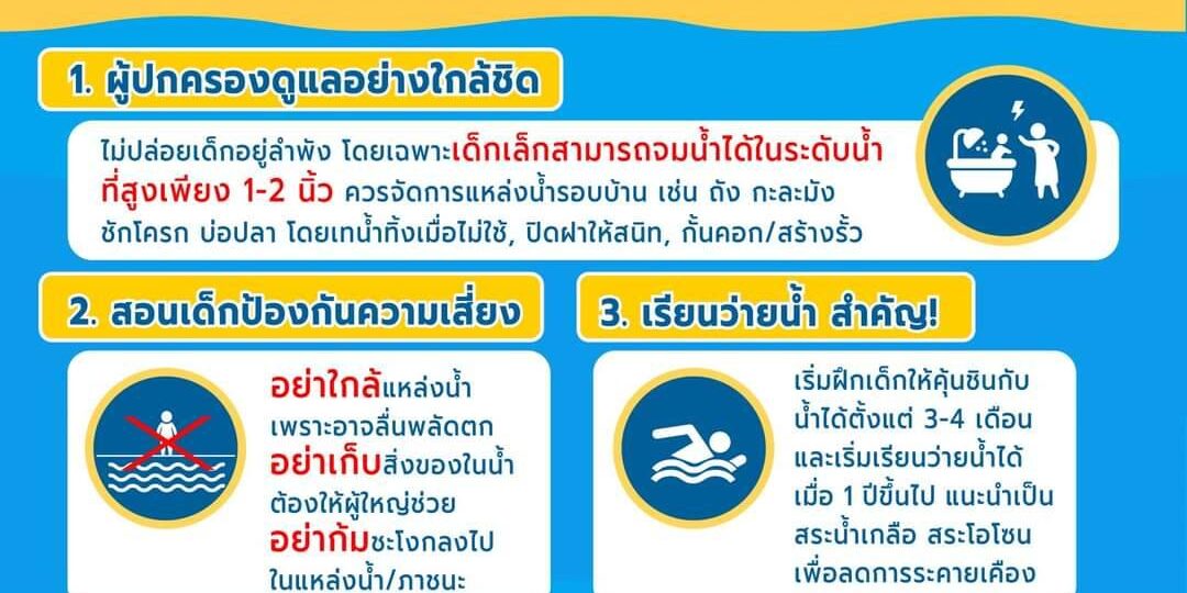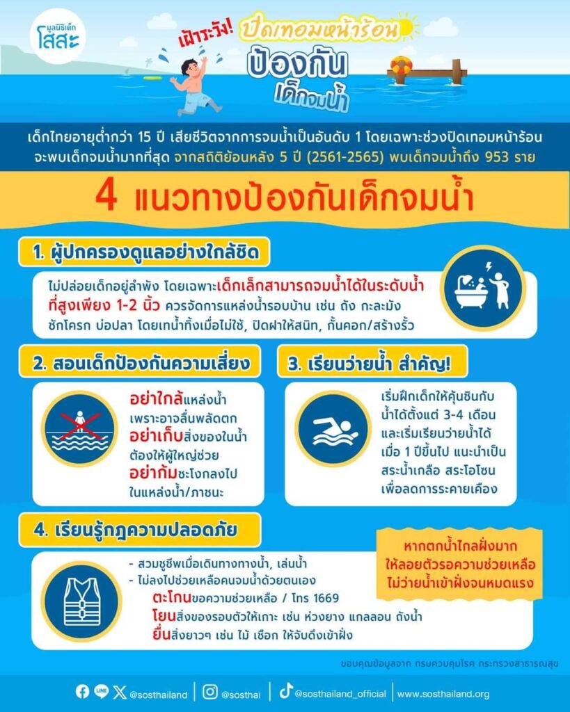 เด็กไทยอายุต่ำกว่า 15 ปี เสียชีวิตจากการจมน้ำเป็นอันดับ 1 โดยเฉพาะช่วงปิดเทอมหน้าร้อน จะพบเด็กจมน้ำมากที่สุด จากสถิติย้อนหลัง 5 ปี (2561-2565) พบเด็กจมน้ำถึง 953 ราย