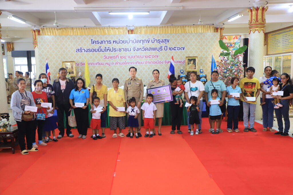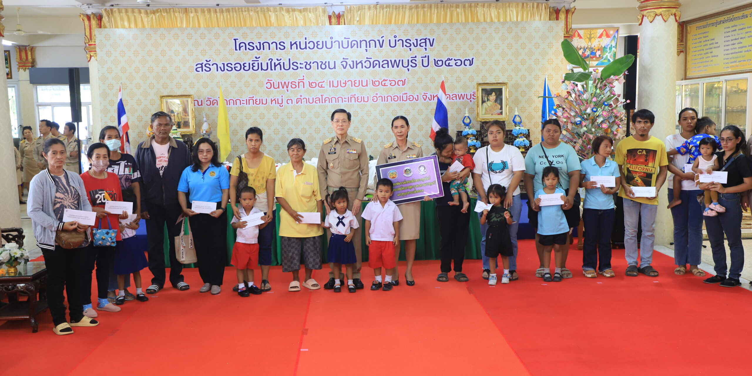 ทั้งนี้ ผู้ว่าราชการจังหวัดลพบุรี และหัวหน้าส่วนราชการ ได้ร่วมกันมอบเงินกองทุนพัฒนาเด็กชนบทในพระราชูปถัมป์สมเด็จพระเทพรัตนราชสุดาฯ สยามบรมราชกุมารีในการอุปการะเด็กชนบท การมอบเงินสงเคราะห์ (พมจ.) และถุงยังชีพแก่ผู้ประสบปัญหาทางสังคม (กาชาด) และเยี่ยมชมกิจกรรมการให้บริการประชาชนของส่วนราชการต่าง ๆ ที่ให้บริการประชาชน ซึ่งโครงการบำบัดทุกข์ บำรุงสุข สร้างรอยยิ้มให้ประชาชนจังหวัดลพบุรีจะหมุนเวียนไปตามอำเภอต่าง ๆ เพื่อให้ประชาชนในพื้นที่อำเภอห่างไกลได้มีโอกาสได้รับบริการจากหน่วยงานราชการอย่างเท่าเทียมกัน