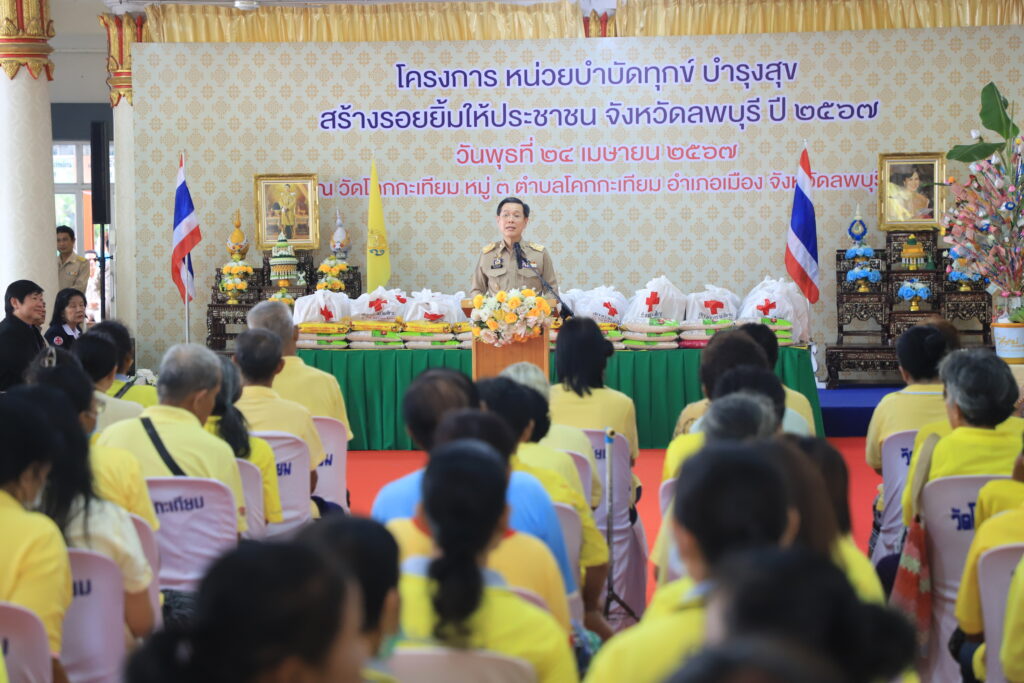 วันที่ 24 เมษายน 2567 ที่ วัดโคกกระเทียม ตำบลโคกกระเทียม อำเภอเมือง จังหวัดลพบุรี นายอำพล อังคภากรณ์กุล ผู้ว่าราชการจังหวัดลพบุรี พร้อมด้วย นายสิทธิชัย หล่อประสงค์สุข สมาชิกสภาผู้แทนราษฎรเขต 1 จังหวัดลพบุรี คณะกรรมการเหล่ากาชาดจังหวัดลพบุรี ส่วนราชการประจำจังหวัดลพบุรี ออกหน่วยบำบัดทุกข์ บำรุงสุข สร้างรอยยิ้มให้ประชาชน ประจำปีงบประมาณ 2567 ทั้งนี้เพื่อบริการประชาชน รับฟังปัญหา ความเดือดร้อนและความต้องการของประชาชน เพื่อที่จะได้ดำเนินการแก้ไขปัญหา ได้อย่างรวดเร็ว และตรงตามความต้องการอย่างแท้จริง นำความสุขรอยยิ้มมามอบให้กับพี่น้องประชาชน