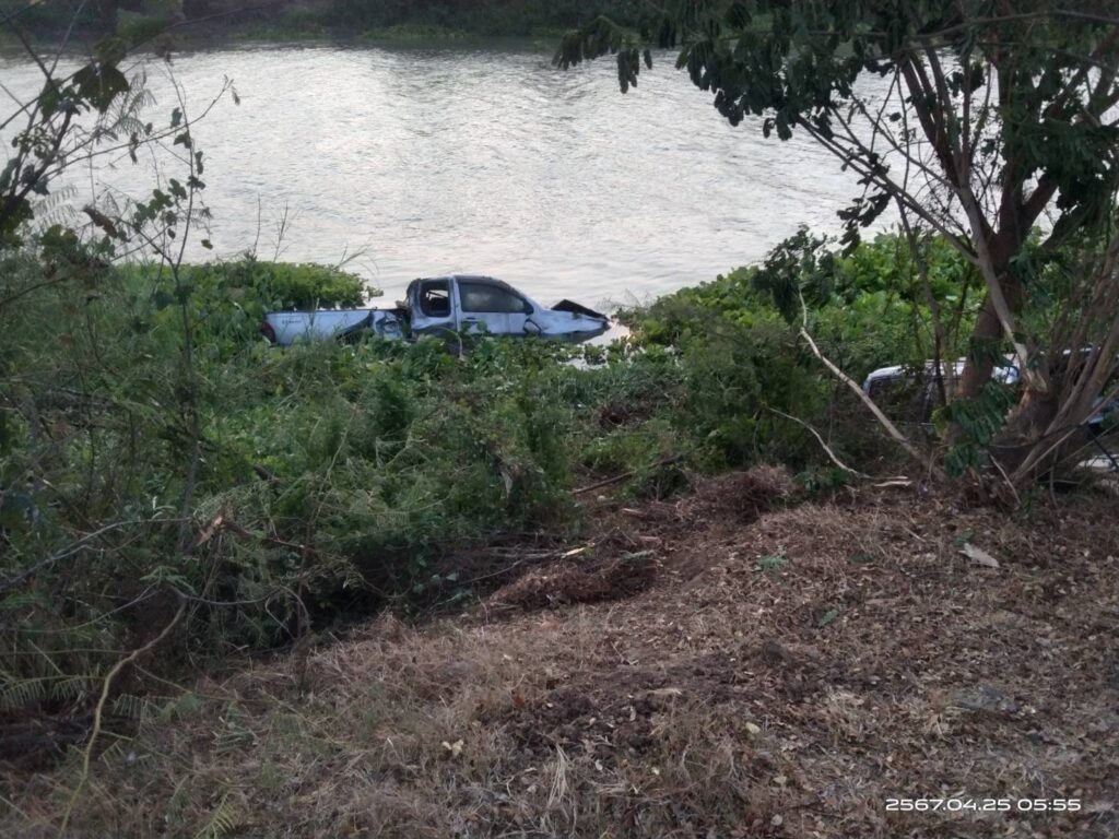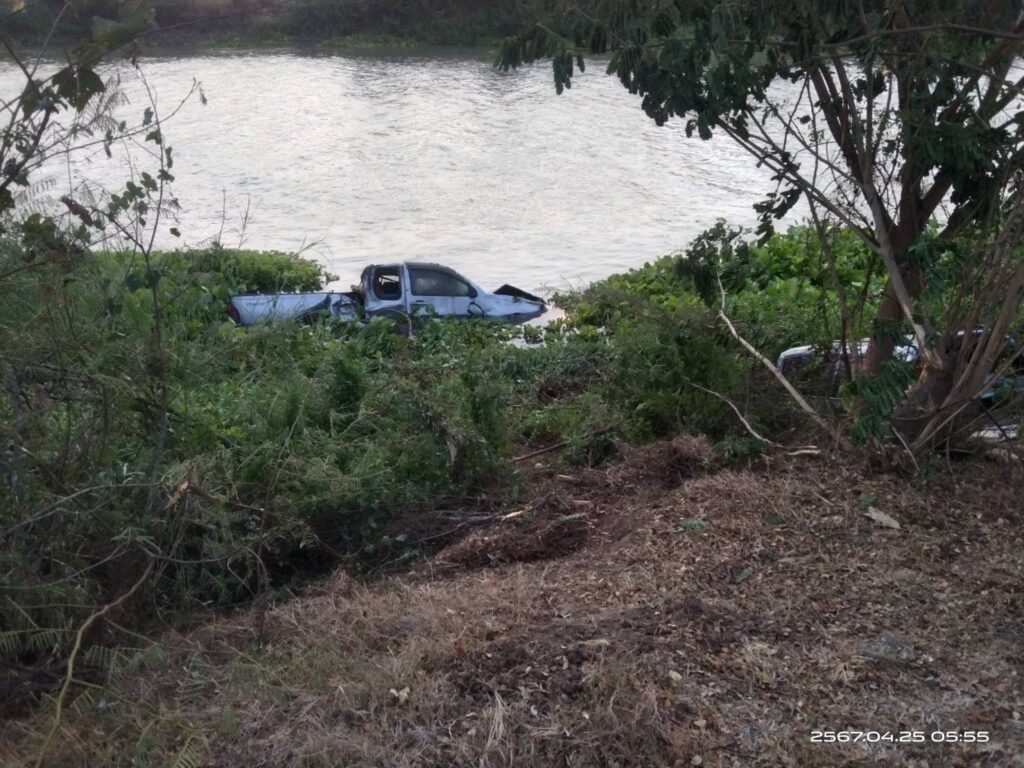 หักหลบตกข้างทางทำให้รถกระบะพุ่งลงคลองคนขับรถกระบะรอดปาฏิหาริย์