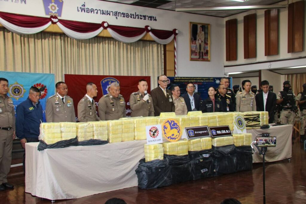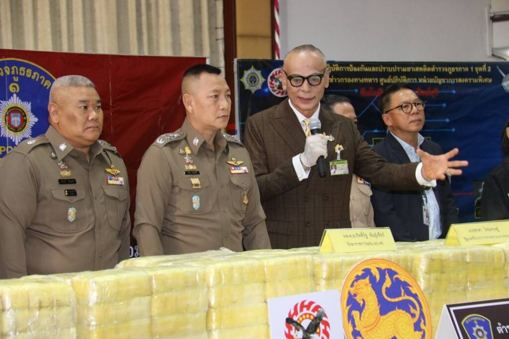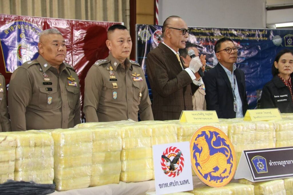: นายชาดา ไทยเศรษฐ์ รัฐมนตรีช่วยว่าการกระทรวงมหาดไทย พร้อมด้วย พล.ต.อ.กิตติ์รัฐ พันธุ์เพ็ชร์ รอง ผบ.ตร.รรท.ผบ.ตร.,พล.ต.ท.จิรสันต์ แก้วแสงเอก ผบช.ภ.1 พร้อมคณะฯ ร่วมแถลงข่าวจับกุมยาเสพติด พร้อมของกลาง ยาบ้า ประมาณ 5,300,000 เม็ด