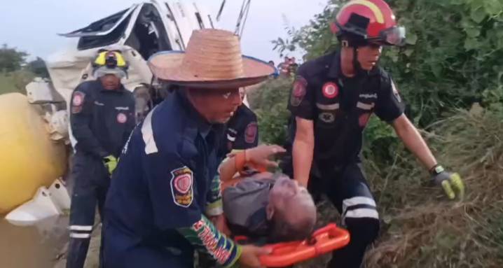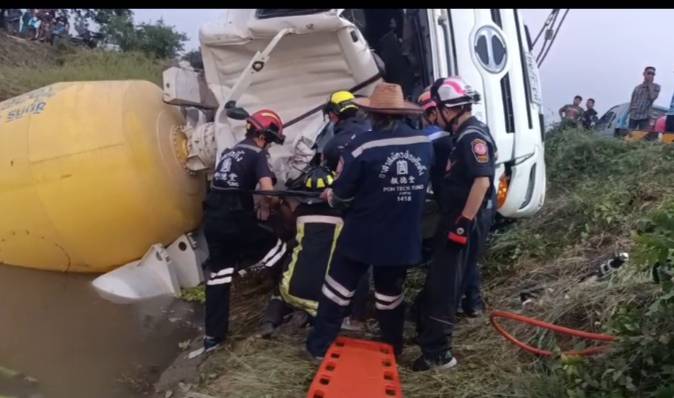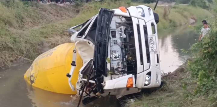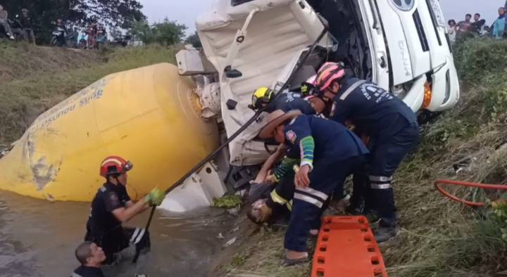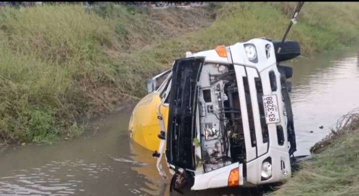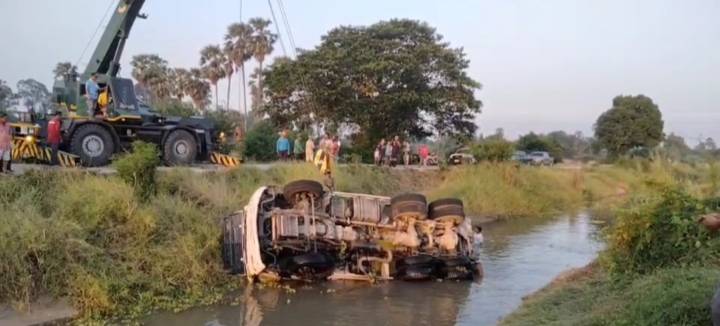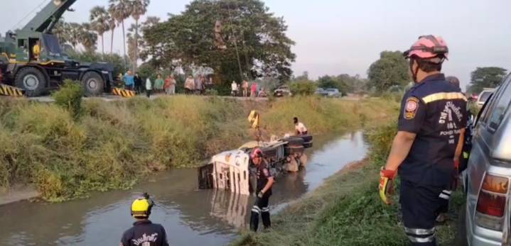 รถปูนตกถนน โชเฟอร์หนีไม่ทัน จมน้ำดับ
