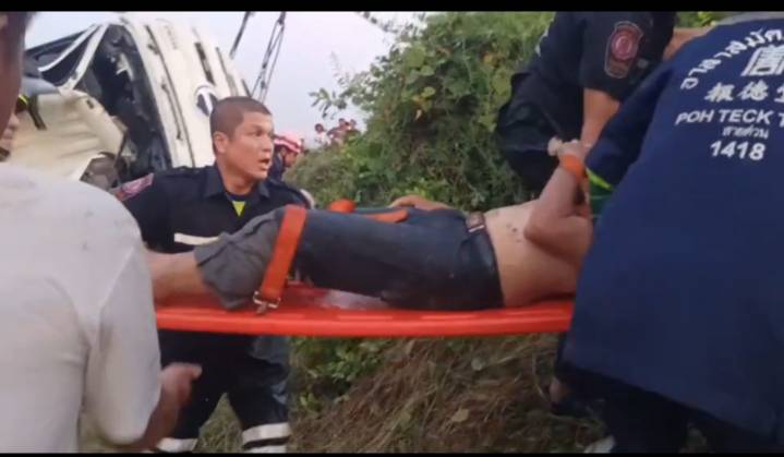 ได้รับแจ้งจากผู้ใช้ทางว่า มีรถบรรทุกพ่วงปูนผง เสียหลักพลิกคว่ำ พุ่งลงไปในคลองชลประทาน