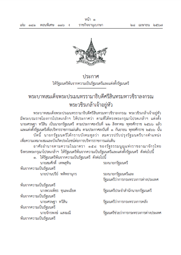 เมื่อวันที่ 28 เม.ย. 2567 ราชกิจจานุเบกษา ลงประกาศเรื่อง ให้รัฐมนตรีพ้นจากความเป็นรัฐมนตรีและแต่งตั้งรัฐมนตรี