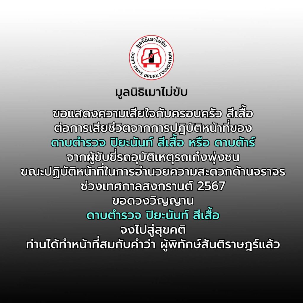 มูลนิธิเมาไม่ขับโดย.นายแพทย์แท้จริง ศิริพานิช เลขาธิการมูลนิธิเมาไม่ขับและนายสุรสิทธิ์ ศิลปงาม ผู้จัดการมูลนิธิเมาไม่ขับ.ขอแสดงความเสียใจกับการจากไปของผู้พิทักษ์สันติราษฎร 2 นาย คือ ร.ต.ต.อัสดา จำเนียรศรี รอง สว.(จร.) สน.บางเขน และด.ต.ปิยนันท์ สีเสื้อ หรือดาบต้าร์ ผู้บังคับหมู่สถานีตำรวจทางหลวง 3 กองกำกับการ 1 กองบังคับการตำรวจทางหลวง (สถานีตำรวจทางหลวงลพบุรี) ซึ่งเสียชีวิตขณะปฎิบัติหน้าที่