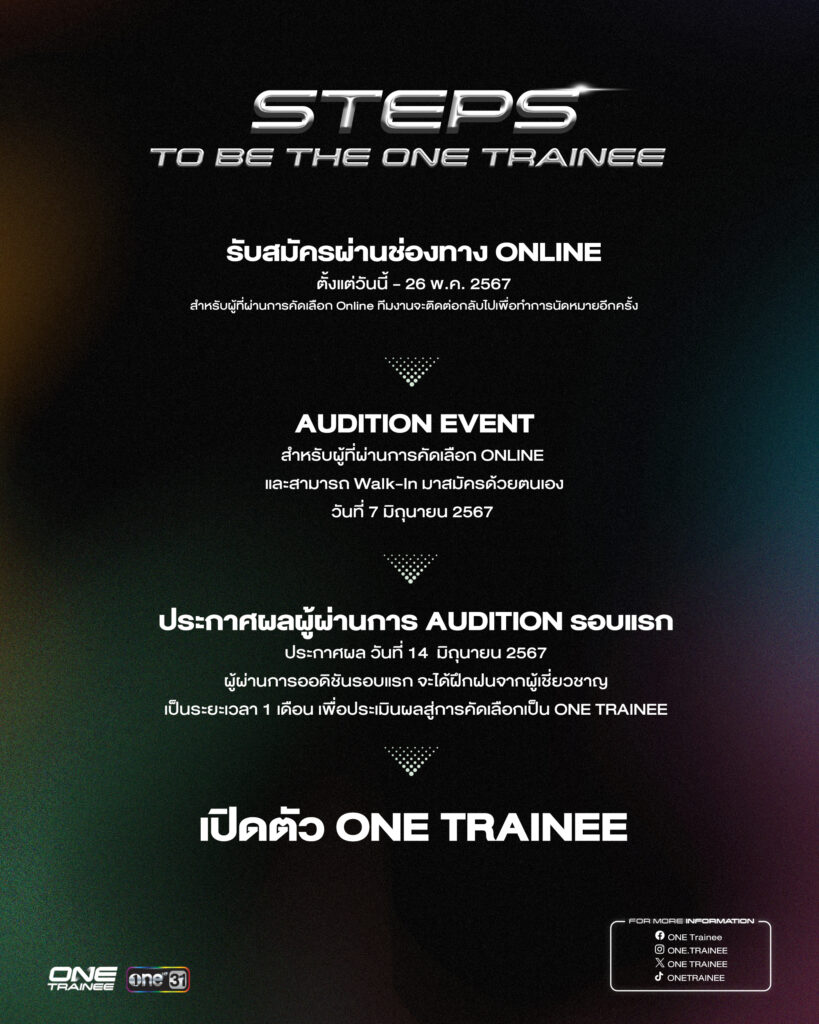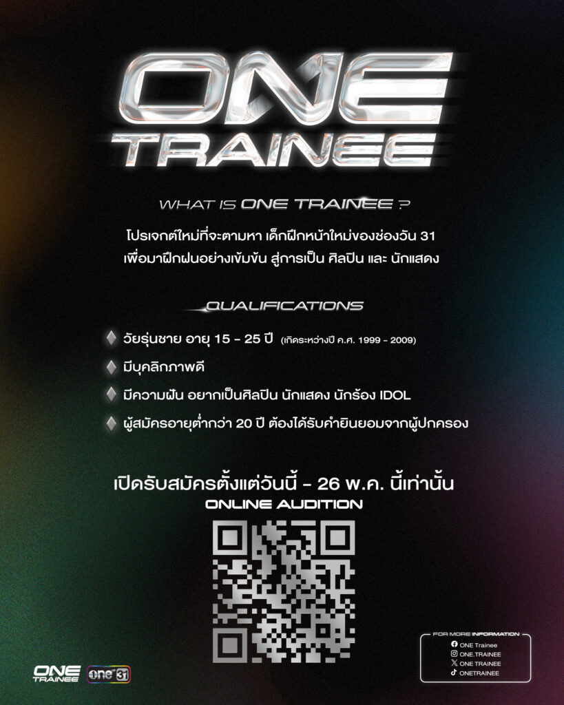 ในฐานะผู้ผลิตคอนเทนต์คุณภาพที่มีความหลากหลาย ทั้งละคร, ข่าว, ซิตคอม, เกมโชว์ และ วาไรตี้ ที่เข้าถึงและตอบโจทย์คนดูทุกกลุ่มเป้าหมายทั้งสาระและบันเทิง ล่าสุด “ช่อง one31” ยังมีเป้าหมายในด้านการผลิตศิลปินรุ่นใหม่เพื่อตอบสนองตลาดไอดอล จึงเป็นที่มาของโปรเจ็กต์ใหม่ “ONE TRAINEE” เพื่อเปิดโอกาสให้กับคนมีฝัน ที่อยากเข้าสู่วงการบันเทิง โดยจะเปิดคัดเลือกเฉพาะหนุ่มวัยทีนจากทั่วประเทศ อายุ 15 - 25 ปี ที่มีรูปร่าง หน้าตา และบุคลิกภาพที่ดี ที่อยากก้าวเข้าสู่วงการบันเทิง เพื่อเป็นศิลปิน นักแสดง นักร้อง และ IDOL ซึ่งผู้ที่ผ่านการคัดเลือก 10 คนสุดท้าย จะได้เซ็นสัญญาเป็น “ศิลปินฝึกหัดช่อง one31” เข้ามาร่วมฝึกฝนและพัฒนาทักษะทั้งทางด้านการร้อง การเต้น และการแสดง เพื่อให้พร้อมรับทุกโอกาสในการสร้างสรรค์ผลงานในวงการบันเทิงต่อไปในอนาคต อีกทั้งยังเป็นใบเบิกทางที่จะได้รับโอกาสในการเล่นละคร และ ซีรีส์ จากผู้สร้างละครมากฝีมือของช่อง one31 หรือโอกาสในการสร้างผลงานเพลง ในฐานะ ศิลปินเดี่ยว หรือ Boy Group อีกด้วย