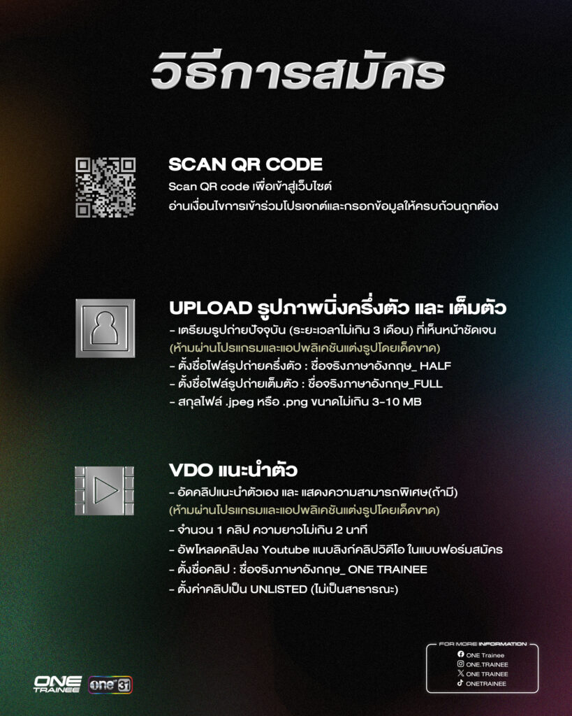 ผู้ที่สนใจเข้าร่วมในโครงการ “ONE TRAINEE” สามารถสมัครได้ตั้งแต่วันนี้ จนถึงวันที่ 26 พ.ค. 2567 โดยกรอกแบบฟอร์มการสมัคร ผ่านช่องทาง Online ที่ https://forms.gle/oUjyWWBDp8SUzkNt6 หรือ ติดตามรายละเอียดเพิ่มเติม ได้ทุกช่องทางหลักของ ONE TRAINEE ทั้ง Facebook | X | Instagram และ TikTok