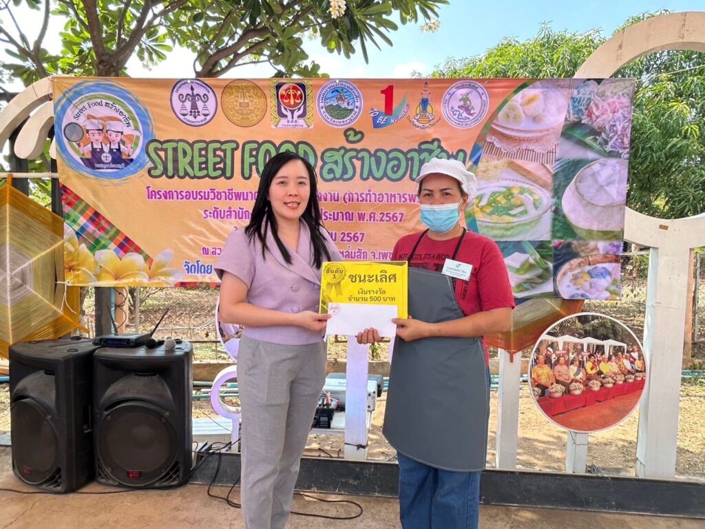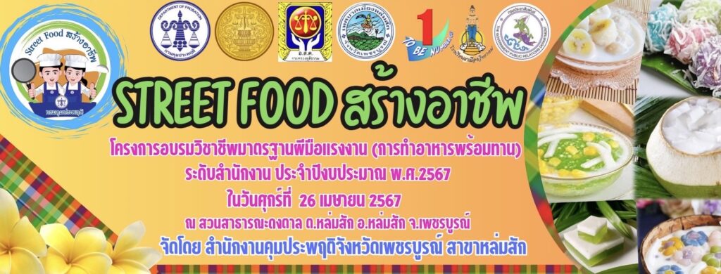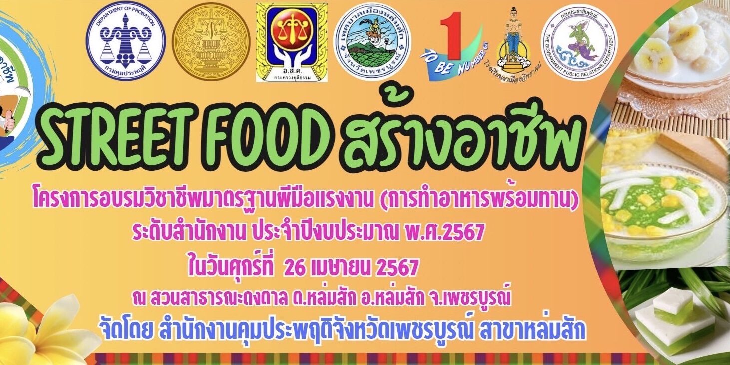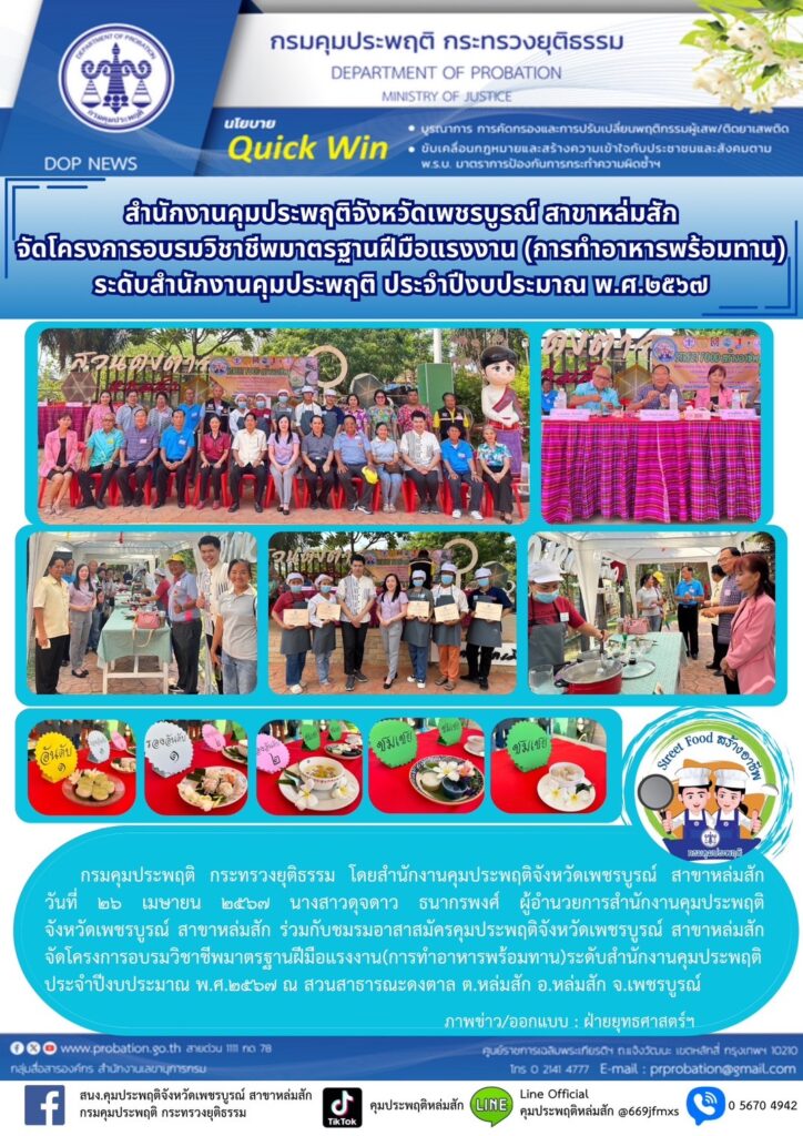 ที่บริเวณสวนสาธารณะดงตาล ตำบลหล่มสัก อำเภอหล่มสัก จังหวัดเพชรบูรณ์ กรมคุมประพฤติ กระทรวงยุติธรรม โดยสำนักงานคุมประพฤติจังหวัดเพชรบูรณ์ สาขาหล่มสัก นางสาวดุจดาว ธนากรพงศ์ ผู้อำนวยการสำนักงานคุมประพฤติจังหวัดเพชรบูรณ์ สาขาหล่มสัก ร่วมกับชมรมอาสาสมัครคุมประพฤติจังหวัดเพชรบูรณ์ สาขาหล่มสัก จัดโครงการอบรมวิชาชีพตามมาตรฐานฝีมือแรงงาน (อาหารพร้อมทาน) และประกวดการทำอาหาร Street Food สร้างอาชีพ ระดับสำนักงานคุมประพฤติ ประจำปีงบประมาณ พ.ศ.2567 เพื่อให้ผู้กระทำผิดที่อยู่ในความดูแลของกรมคุมประพฤติ มีความรู้ความสามารถในการทำอาหารพร้อมทาน ตามมาตรฐานฝีมือแรงงาน สามารถใช้ในการประกอบอาชีพอิสระ และส่งเสริมการมีส่วนร่วมกับหน่วยงานภายนอกให้เข้ามามีส่วนร่วมในการช่วยเหลือผู้กระทำผิดที่อยู่ในความดูแลของกรมคุมประพฤติ