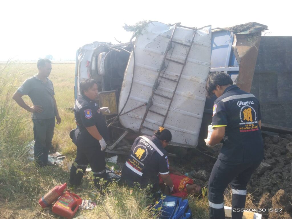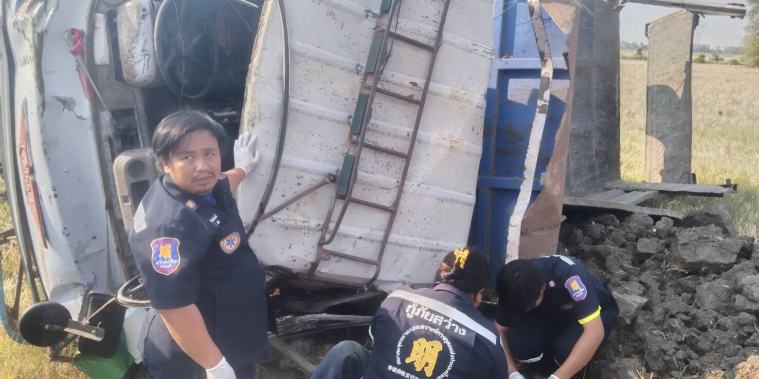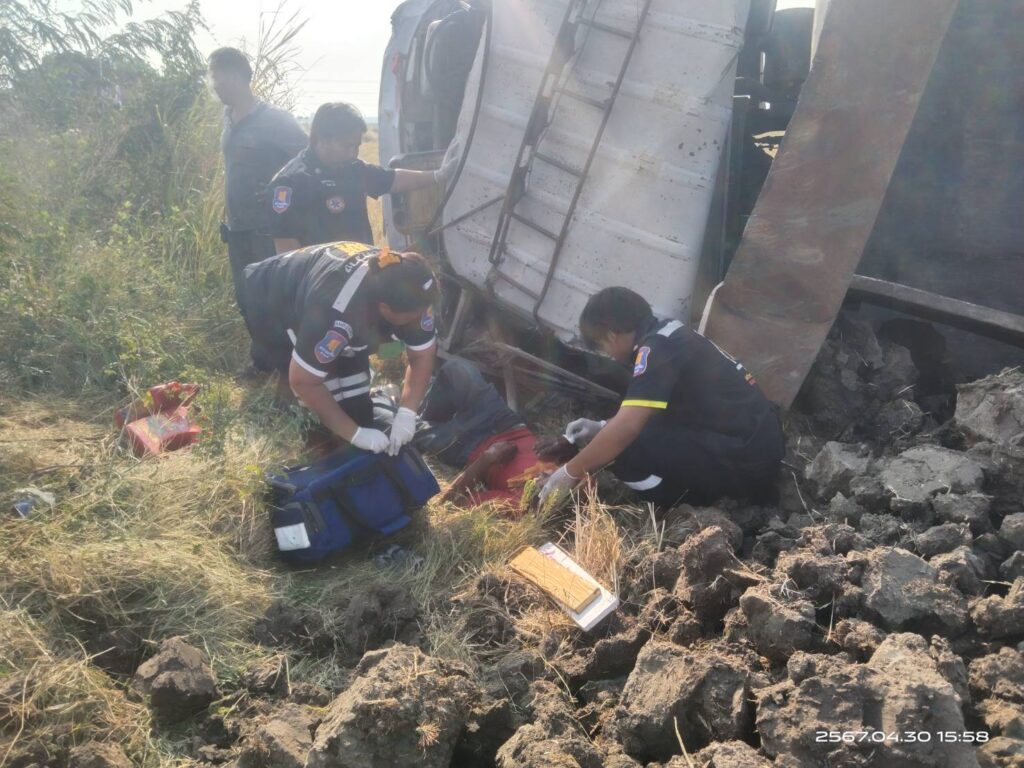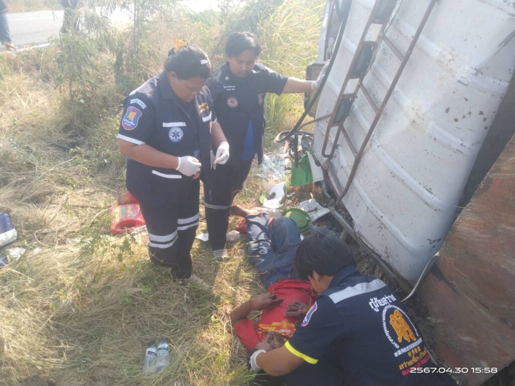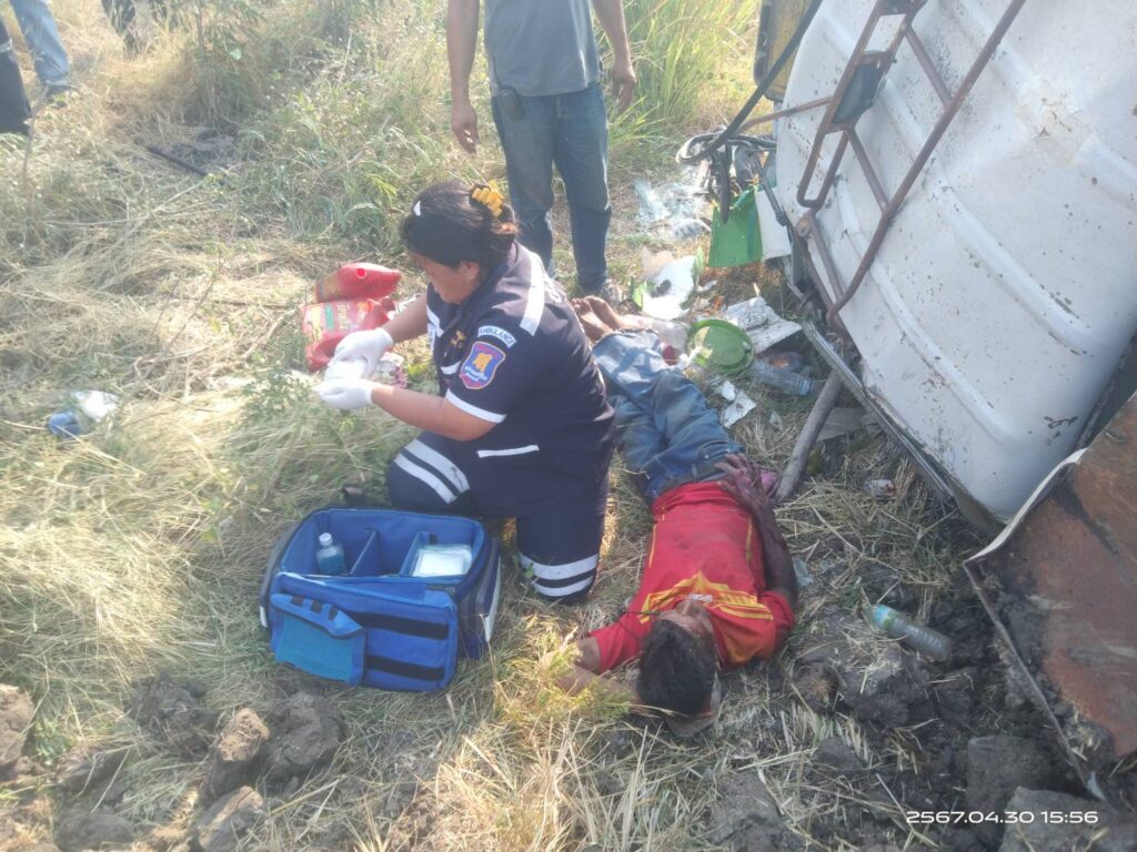 ได้เกิดอุบัติเหตุรถบรรทุกตกข้างทางได้มีผู้บาดเจ็บที่เกิดเหตุ