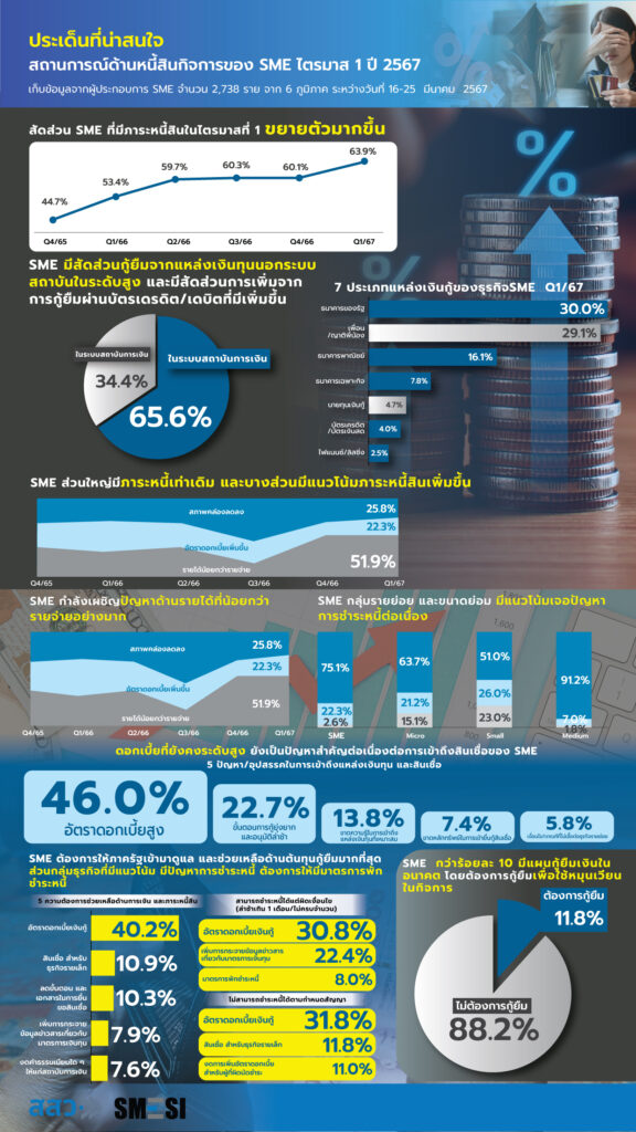 นอกจากนี้ สสว. ได้ทำได้การสำรวจความต้องการของผู้ประกอบการ SME พบว่า ความช่วยเหลือที่ผู้ประกอบการ SME ต้องการมากที่สุดยังคงเป็นเรื่องเกี่ยวกับภาระหนี้สิน และเงินทุน ทั้งในภาคหนี้สินครัวเรือน และภาคธุรกิจ เช่น การลดอัตราดอกเบี้ยเงินกู้ มาตรการพักชำระหนี้และการแก้ไขปัญหาหนี้เสีย เป็นต้น สำหรับความช่วยเหลือด้านต้นทุนคือต้องการให้ช่วยเหลือเรื่องการลดค่าสาธารณูปโภค การควบคุมราคาสินค้า/วัตถุดิบ ราคาน้ำมันเชื้อเพลิง รวมถึงในช่วงนี้ปัจจัยด้านกำลังซื้อที่เริ่มชะลอตัวลง ผู้ประกอบการ SME จึงต้องการให้ภาครัฐออกนโยบายหรือมาตรการที่กระตุ้นการใช้จ่าย มาตรการส่งเสริมการท่องเที่ยว หรือการส่งเสริมการสร้างรายได้และอาชีพ เพื่อสร้างกำลังซื้อที่ยั่งยืน นอกจากนี้ ผู้ประกอบการ SME ยังต้องการให้ภาครัฐช่วยเพิ่มศักยภาพธุรกิจเพื่อผลักดันไปสู่การเปิดตลาดในต่างประเทศ