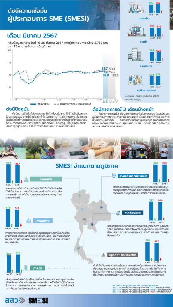 นายวีระพงศ์ มาลัย ผู้อำนวยการสำนักงานส่งเสริมวิสาหกิจขนาดกลางและขนาดย่อม (สสว.) เผยดัชนีความเชื่อมั่นผู้ประกอบการ SME (SMESI) ประจำเดือนมีนาคม 2567 อยู่ที่ระดับ 53.0 ซึ่งปรับตัวลดลงจากระดับ 53.7 เมื่อเปรียบเทียบกับเดือนก่อนหน้า และเป็นการปรับตัวลดลงต่อเนื่องเป็นเดือนที่ 2 สาเหตุมาจากคำสั่งซื้อและกำไรในภาคการค้าและภาคการบริการที่ชะลอตัวลงจากภาวะเศรษฐกิจในประเทศและปัจจัยด้านกำลังซื้อ ในขณะที่ภาคการผลิตมีการขยายตัวเพิ่มขึ้นเพื่อเตรียมรองรับและชดเชยวันหยุดช่วงเทศกาลสงกรานต์ รวมถึงภาคธุรกิจการเกษตรที่ปรับตัวเพิ่มขึ้นจากราคาสินค้าเกษตรที่ปรับสูงขึ้นต่อเนื่อง
