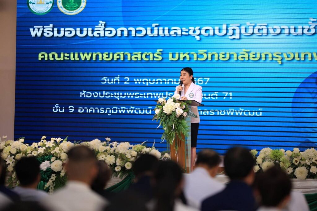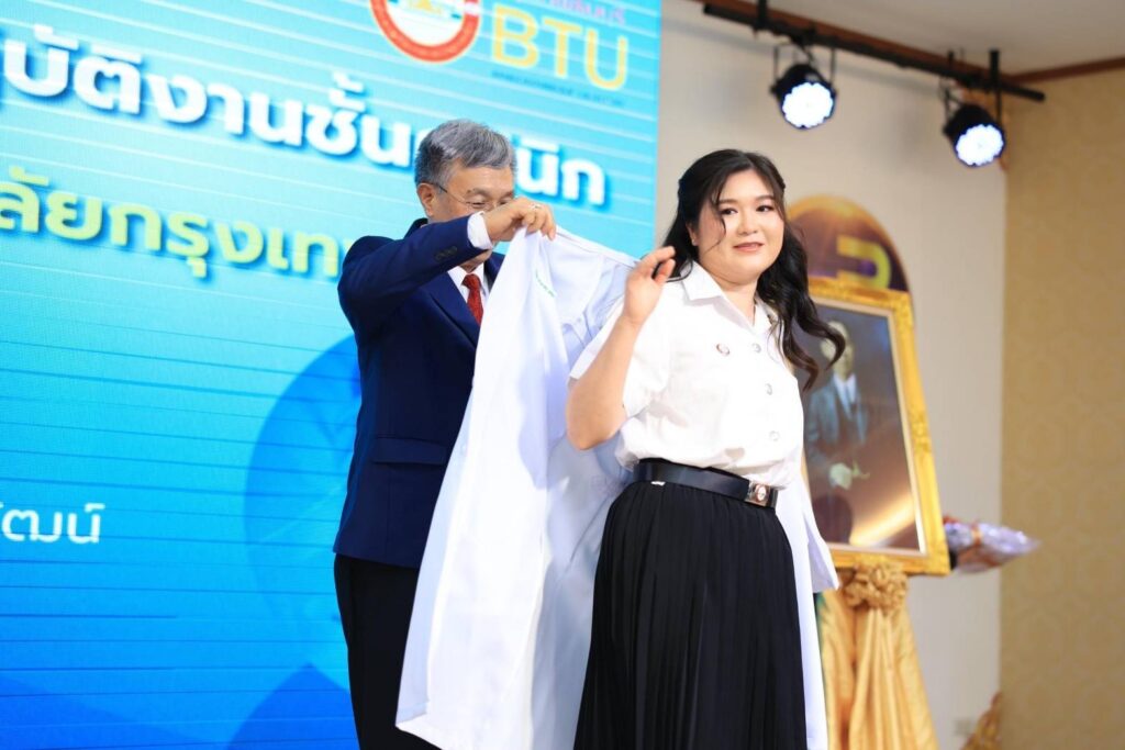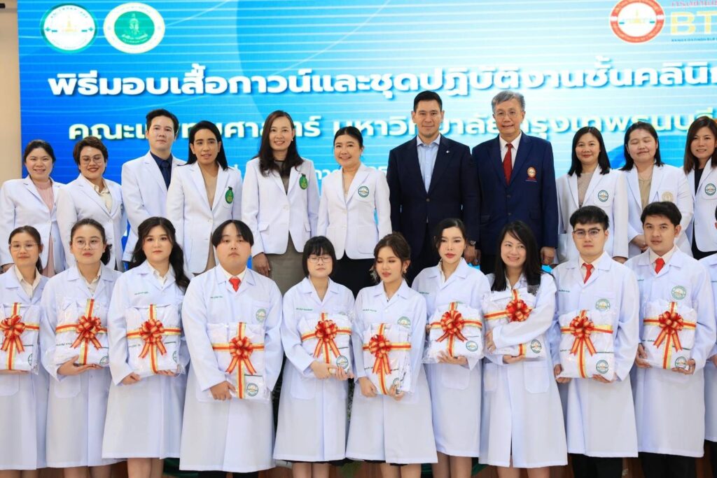 ศ.ดร.บังอร เบ็ญจาธิกุล อธิการบดี มหาวิทยาลัยกรุงเทพธนบุรี (มกธ.) เป็นประธานในพิธีมอบเสื้อกาวน์และชุดปฏิบัติงานแก่นักศึกษาแพทย์ ชั้นปีที่ 4 คณะแพทยศาสตร์ มหาวิทยาลัยกรุงเทพธนบุรี ประจำปีการศึกษา 2567 พร้อมให้โอวาทแก่นักศึกษาแพทย์ที่เข้ารับเสื้อกาวน์และชุดปฏิบัติงานดังกล่าว
