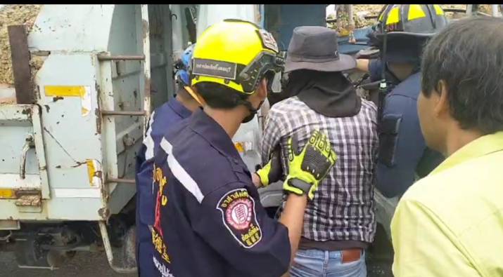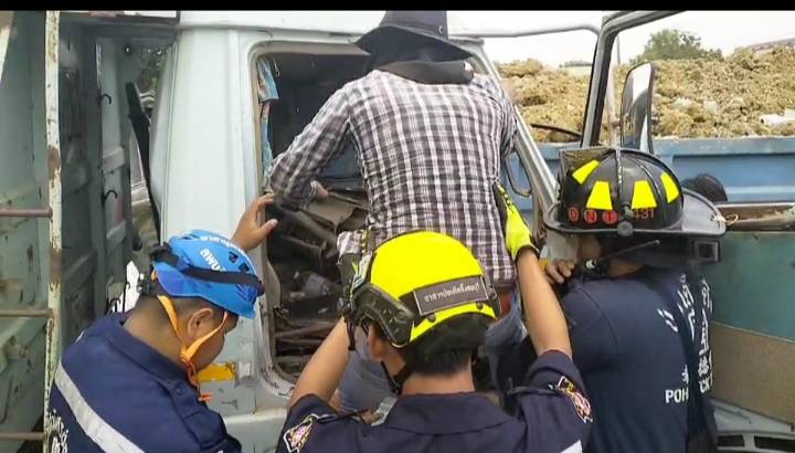 รับแจ้งอุบัติเหตุรถบรรทุก หกล้อประสานงานชนท้ายรถบรรทุกด้วยกันมีผู้บาดเจ็บติดอยู่ในรถจำนวน 1 ราย