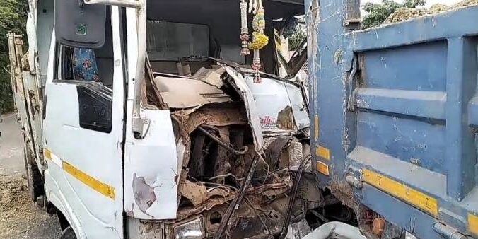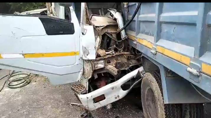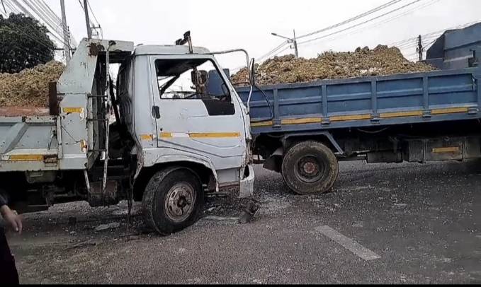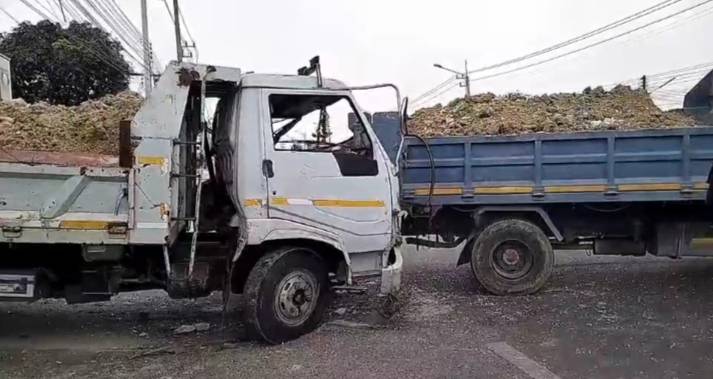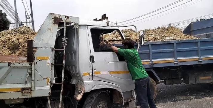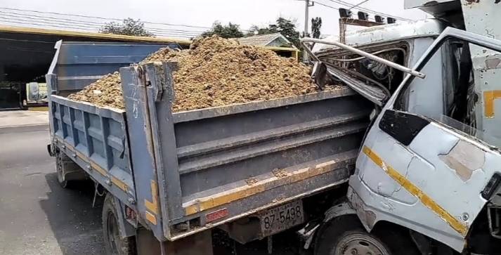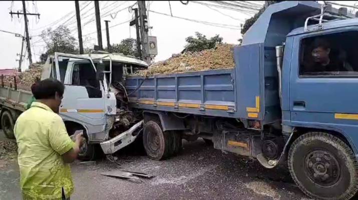 เอารถไม่อยู่หกล้อขนดินมาเต็มคัน ชนสนั่น ประสานงานกันเอง คนขับติดอยู่ในรถบาดเจ็บเล็กน้อยรอดปาฏิหาริย์ เสียหลักรถกระบะโดนชนไปด้วย