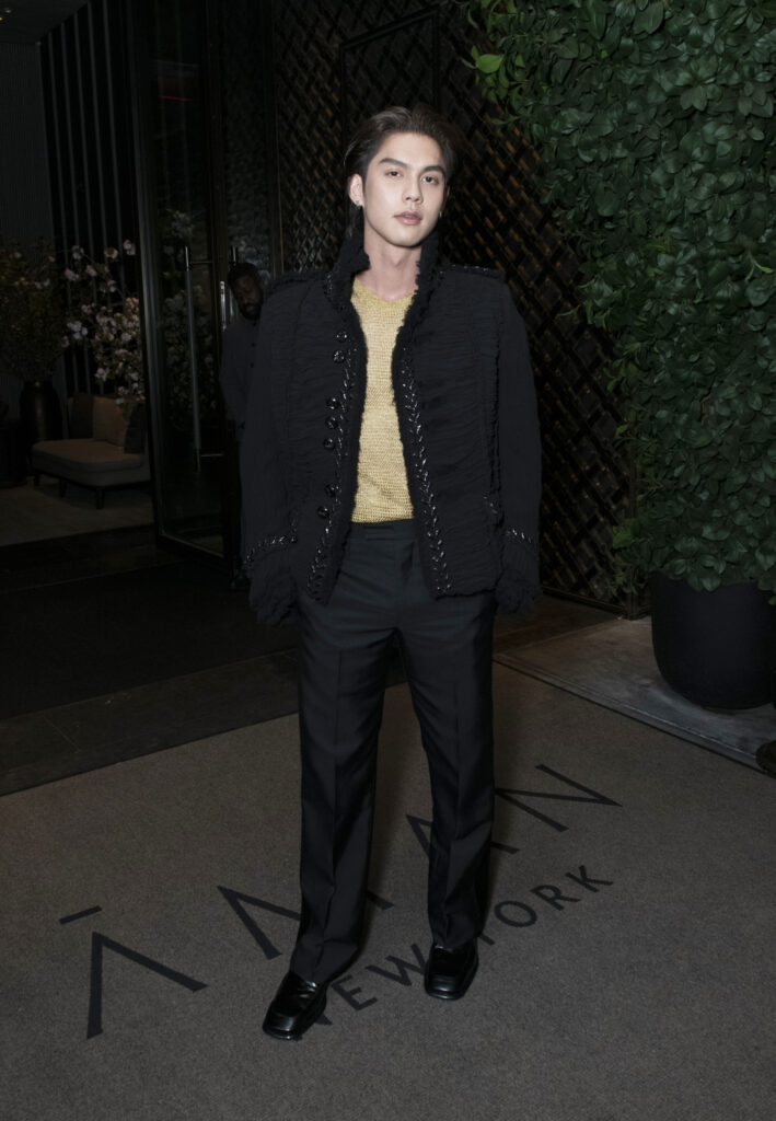 งานนี้ ’ไบร์ท วชิรวิชญ์ ชีวอารี‘ มาในลุค Burberry ที่สั่งตัดพิเศษ พร้อมออกแบบและตัดเย็บโดย Daniel Lee ไบร์ทสวมชุดแจ็กเก็ตผ้าจอร์เจ็ตจับพลีต ตกแต่งลายปักดอกไม้ กางเกงทักซิโด้ผ้าไหมแต่งแถบข้างตัว