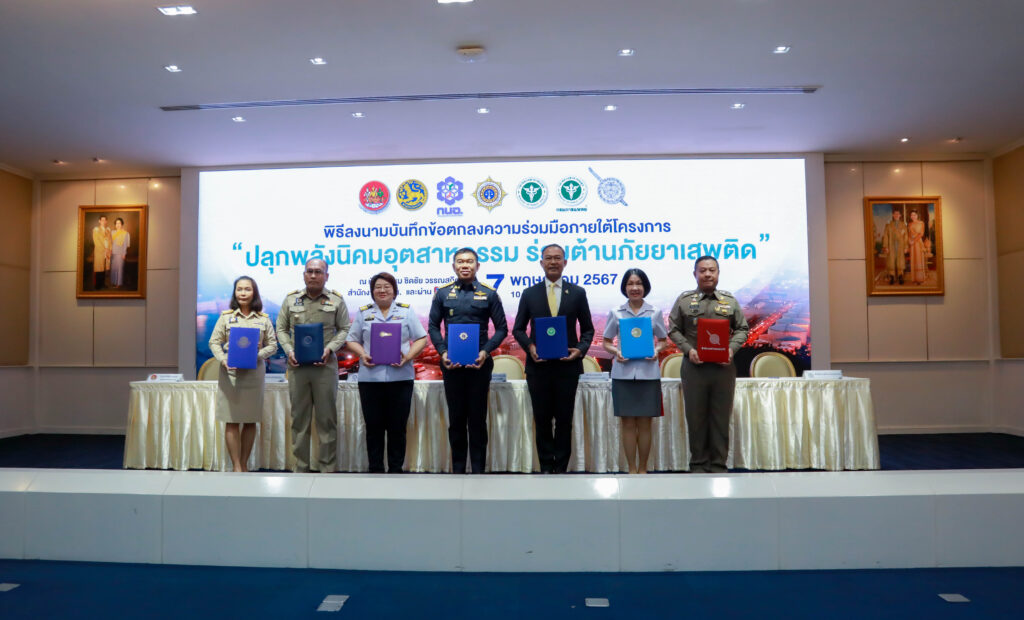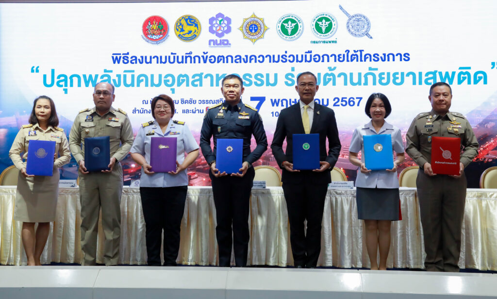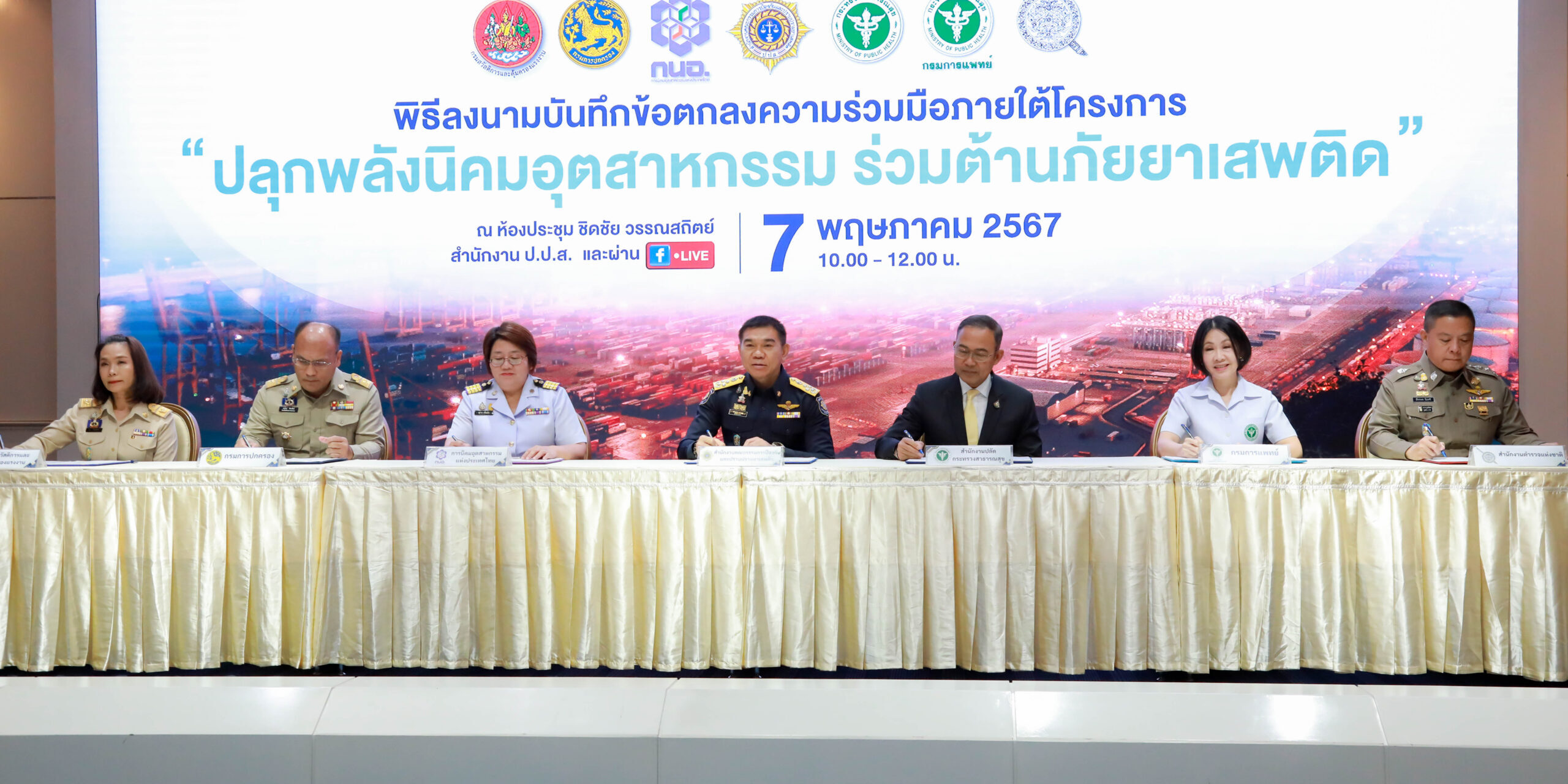 วันที่ 7 พฤษภาคม 2567 สำนักงาน ป.ป.ส. โดย พล.ต.ท.ภาณุรัตน์ หลักบุญ เลขาธิการ ป.ป.ส. ร่วมกับ การนิคมอุตสาหกรรมแห่งประเทศไทย กรมสวัสดิการและคุ้มครองแรงงาน กรมการปกครอง สำนักงานปลัดกระทรวงสาธารณสุข และกรมการแพทย์ กระทรวงสาธารณสุข และสำนักงานตำรวจแห่งชาติ ลงนามข้อตกลงความร่วมมือภายใต้โครงการ ปลุกพลังนิคมอุตสาหกรรม ร่วมต้านภัยยาเสพติด โดยมี นางบุปผา กวินวศิน รองผู้ว่าการการนิคมอุตสาหกรรมแห่งประเทศไทย (สายงานพัฒนาที่ยั่งยืน),นายอรรษิษฐ์ สัมพันธรัตน์ อธิบดีกรมการปกครอง,นางโสภา เกียรตินิรชา อธิบดีกรมสวัสดิการและคุ้มครองแรงงาน,นายแพทย์กิตติศักดิ์ อักษรวงศ์ รองปลัดกระทรวงสาธารณสุข,แพทย์หญิงอัมพร เบญจพลพิทักษ์ อธิบดีกรมการแพทย์,พล.ต.ท.อัคราเดช พิมลศรี ผู้ช่วยผู้บัญชาการตำรวจแห่งชาติ ร่วมลงนามข้อตกลง ณ ห้องประชุมชิดชัย วรรณสถิตย์ สำนักงาน ป.ป.ส.