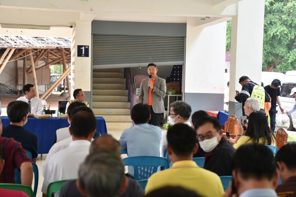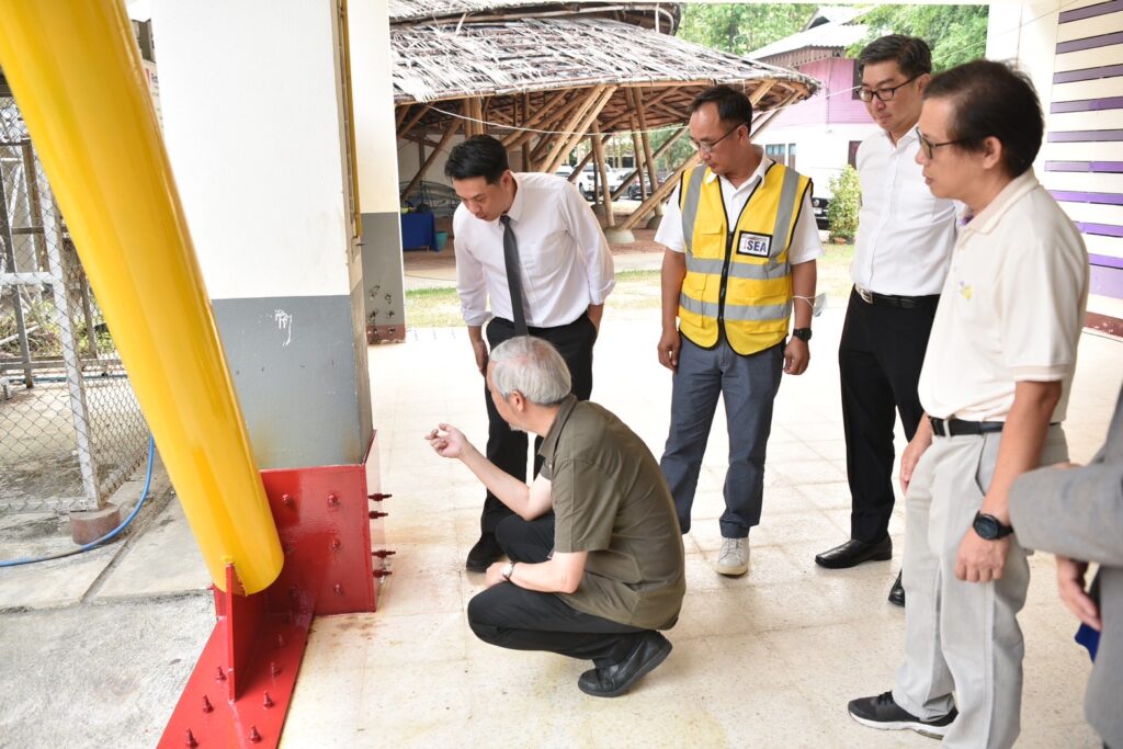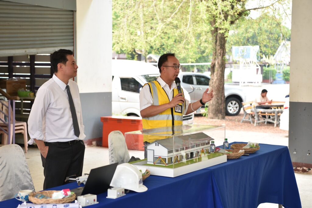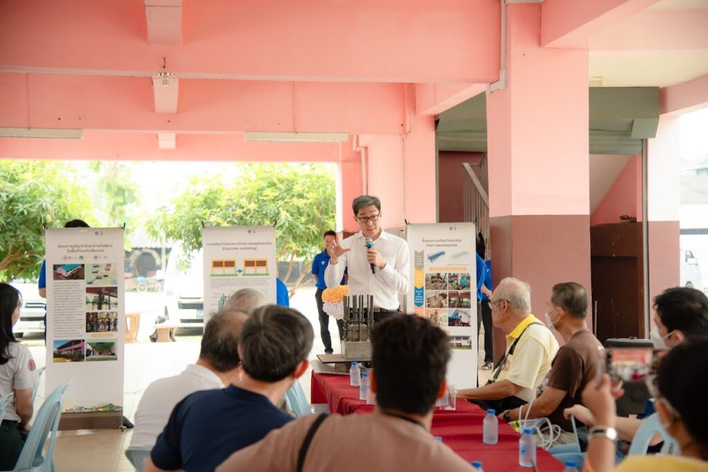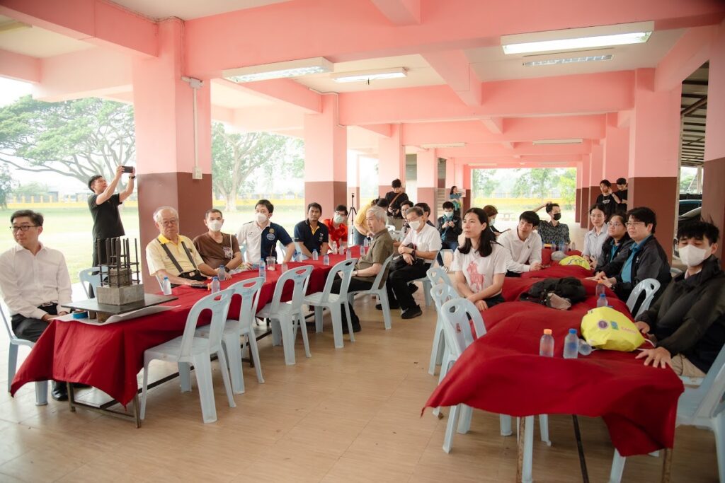 จุดที่ 5) “โรงเรียนศรีถ้อยสุนทรราษฎร์วิทยา” นำโดย รศ.ดร.สุทัศน์ ลีลาทวีวัฒน์ จาก มหาวิทยาลัยเทคโนโลยีพระจอมเกล้าธนบุรี ซึ่งได้รับเกียรติจาก นายรักษ์ชัย ฉัตรเงิน ผู้อำนวยการโรงเรียน กล่าวต้อนรับ และรศ.ดร.สุทัศน์ฯ กล่าวว่า แม้ว่าในวันเกิดเหตุแผ่นดินไหวโรงเรียนจะได้รับความเสียหายไม่มากนัก แต่จากการดำเนินการสำรวจของทีมวิจัย พบว่า โรงเรียนตั้งอยู่ในพื้นที่ที่มีความเสี่ยง และอาคารของโรงเรียนมีรูปแบบที่เหมาะสมที่จะดำเนินการปรับปรุงให้มีความแข็งแรงมากขึ้น ด้วยวิธีเสริมความแข็งแรงของเสาอาคารเรียน หรือ concrete jacketing ซึ่งเป็นอีกวิธีหนึ่งที่ทำให้อาคารเดิมที่มีอยู่แล้วสามารถรองรับแรงแผ่นดินไหวได้มากขึ้นและป้องกันความเสียแก่อาคารเรียนได้ดียิ่งขึ้น