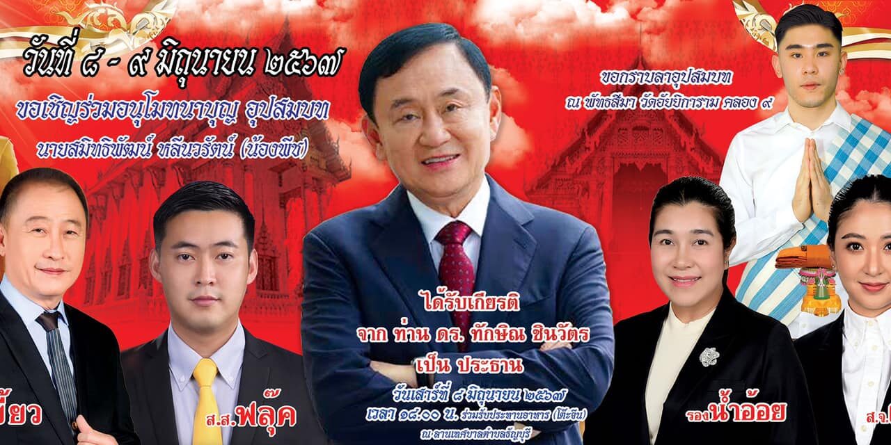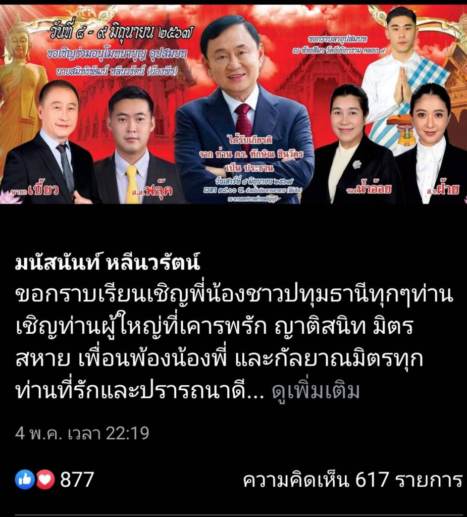 จากเพจเฟสบุค มนัสนันท์ หลีนวรัตน์ หรือ ส.ส.ฟลุ๊ค สมาชิกสภาผู้แทนราษฎร เขต5 ปทุมธานี พรรคเพื่อไทย ได้โพสงานบวช พร้อมภาพอดีตนายกทักษิณ ชินวัตร พร้อมกับภาพ นาย มนัสนันท์ หลีนวรัตน์ (ส.ส.ฟลุ๊ค) สมาชิกสภาผู้แทนราษฏร เขต5 ปทุมธานี เพื่อไทย , นายกฤษฎา หลีนวรัตน์ (นายกเบี้ยว) นายกเทศมนตรีตำบลธัญบุรี และ รองน้ำอ้อย และ ส.จ.ฝ้าย เชิญชวนพี่น้องชาวปทุมธานีทุกๆท่าน เชิญท่านผู้ใหญ่ที่เคารพรัก ญาติสนิท มิตรสหาย เพื่อนพ้องน้องพี่ และกัลยาณมิตรทุกท่านที่รักและปรารถนาดี (ไม่มีแจกการ์ด) มีความยินดี เชิญทุกๆท่าน ร่วมอนุโมทนากุศล เนื่องในงานอุปสมบท นายสมิทธิพัฒน์ (น้องพีช) หลีนวรัตน์ในวันเสาร์ที่ 8 มิถุนายน 2567 เวลา 10.00 น.ปลงผมนาค ณ วัดอัยยิการาม คลอง 9 และที่ลานข้างเทศบาลตำบลธัญบุรี (คลอง7) ต.ลำผักกูด อ.ธัญบุรี จ.ปทุมธานี 18.00 น. เชิญร่วมรับประทานอาหาร (โต๊ะจีน)