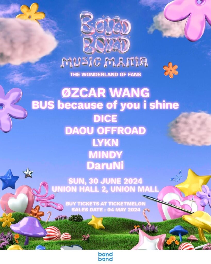 เรียกได้ว่าเป็นเฟสติวัลใหม่ที่ไม่น้อยหน้าใครเลย ที่ทั้งขนศิลปินมาแบบแน่นๆ ให้สิทธิพิเศษสำหรับแฟนๆ ได้อย่างใกล้ชิด ใครที่เป็นแฟนคลับของศิลปินเหล่านี้ต้องห้ามพลาด พบกับงาน bondbond Music Mania ได้ในวันที่ 30 มิถุนายน 2567 ณ Union Hall 2, Union Mall เริ่มจำหน่ายบัตร วันที่ 4 พฤษภาคม 2567 เวลา 11.00 น. เป็นต้นไปทาง www.ticketmelon.com บัตร Early Bird ราคา 2,399 บาท / 1,999 บาท สำหรับผู้ที่ซื้อบัตรระหว่างวันที่ 4 – 10 พฤษภาคม 2567 และบัตร General ราคา 3,000 และ 1,500 บาท สำหรับผู้ที่ซื้อบัตรระหว่างวันที่ 11 พฤษภาคม – 30 มิถุนายน 2567 ติดตามรายละเอียดเพิ่มเติมที่ช่องทางโซเชียลมีเดียของ bondbond Live ได้ทุกช่องทาง