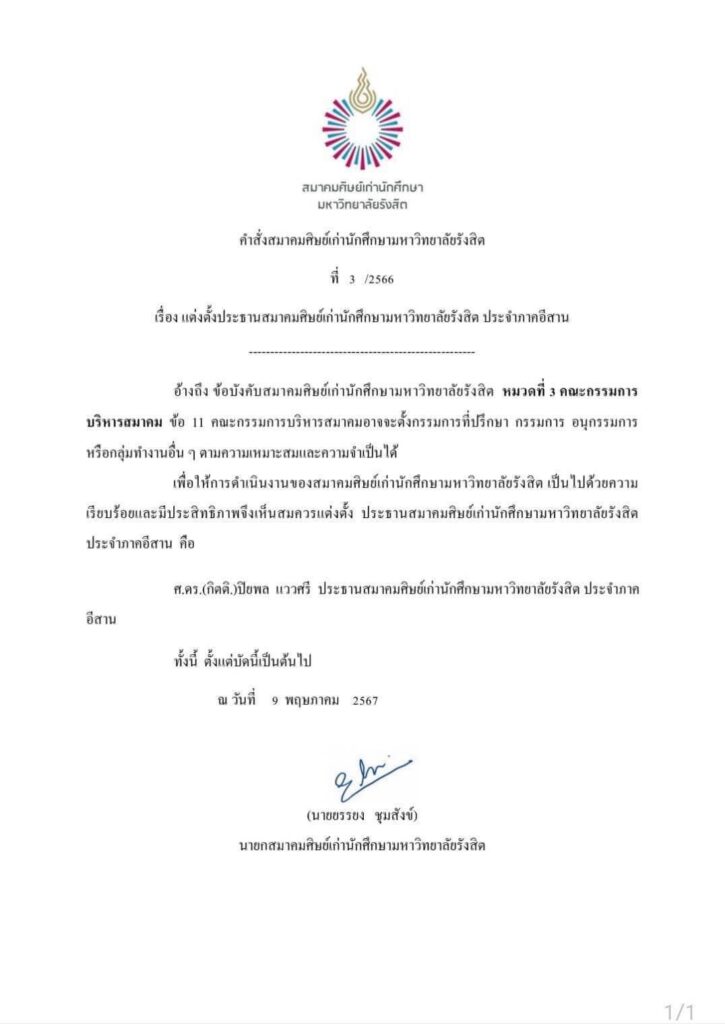 จากการที่สมาคมศิษย์เก่านักศึกษามหาวิทยาลัยรังสิต ได้ออกประกาศแต่งตั้ง ศ.ดร.(กิตติ.) ปิยพล แววศรี ซึ่งเป็นชาวจังหวัดอุบลราชธานี เป็นประธานสมาคมศิษย์เก่านักศึกษามหาวิทยาลัยรังสิต ประจำภาคอีสาน ประกาศ ณ วันที่ 9 พฤษภาคม 2567 เพื่อให้การดำเนินงานของสมาคมฯ เป็นไปด้วยความเรียบร้อยและมีประสิทธิภาพ