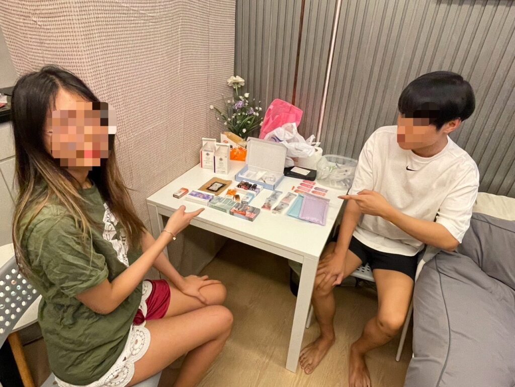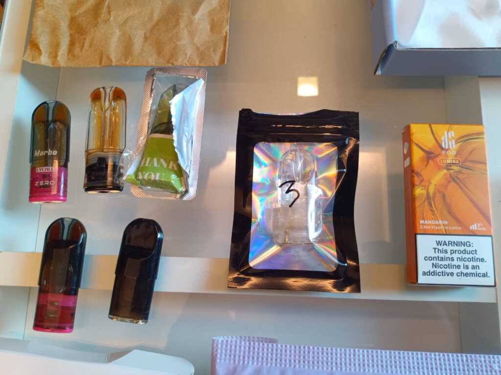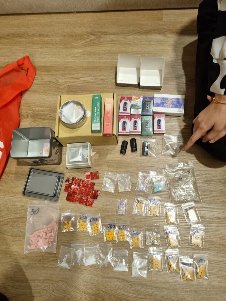 จึงขอตรวจค้น ผลการตรวจค้นพบยาเสพติด ประเภทยาอี Happy Water คีตามีน MDMA ไฟว์ไฟว์ และหัวบุหรี่ไฟฟ้าที่มีสารเสพติดผสม (พอตเค) อีกจำนวนหนึ่ง