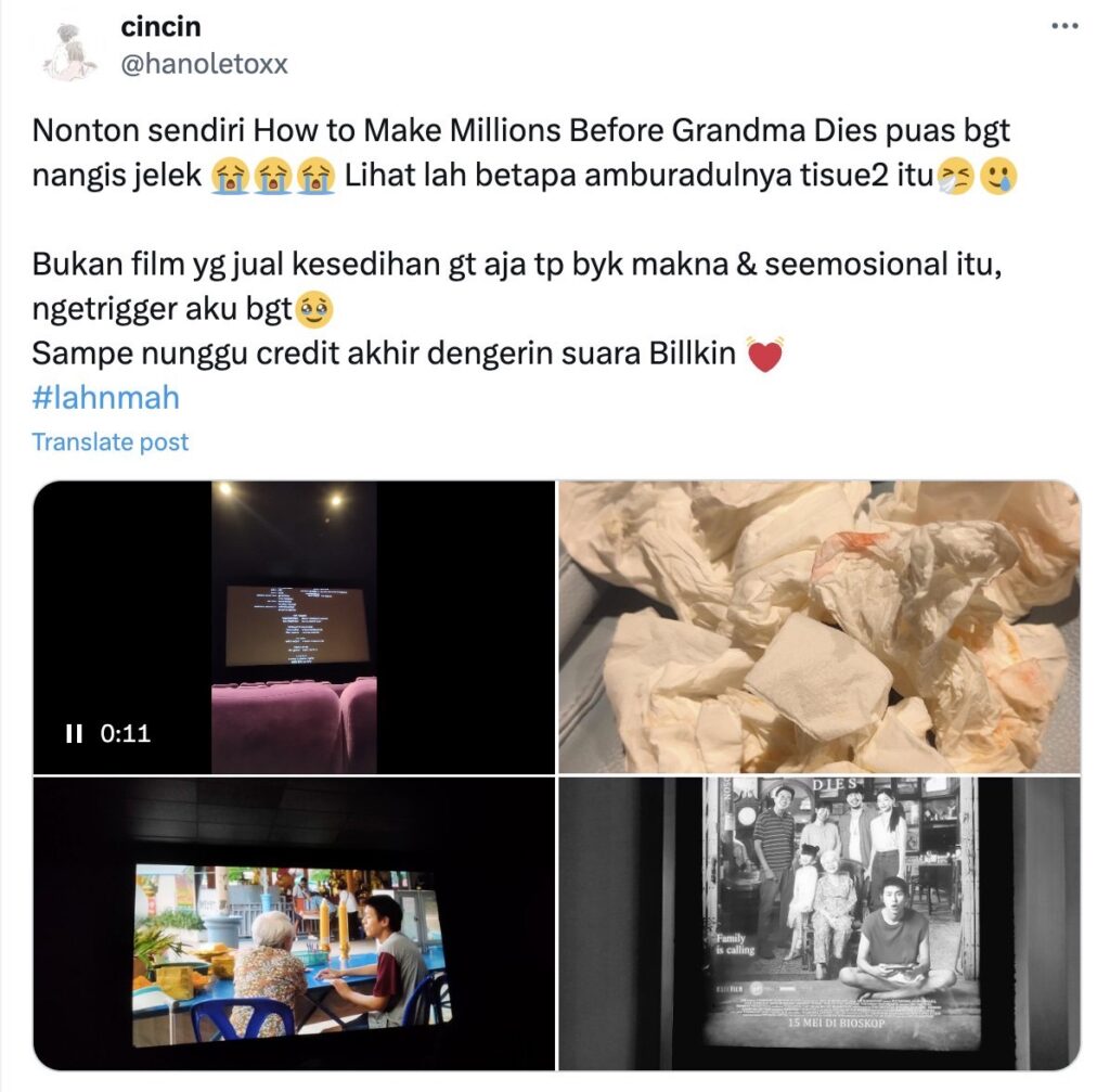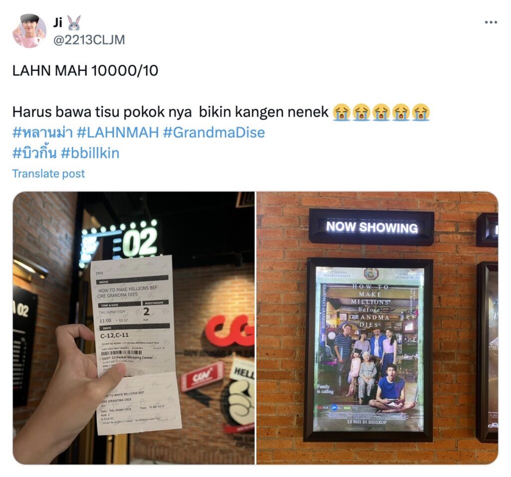 ทำชาวอินโดนีเซียซาบซึ้งประทับใจไปตามๆ กัน สำหรับ ‘หลานม่า’ ภาพยนตร์จาก GDH ที่กำลังออกฉายในหลายประเทศ ประเดิมที่อินโดนีเซียเป็นที่แรก โดยมีรอบฉายอย่างเป็นทางการเมื่อวันที่ 15 พฤษภาคม ที่ผ่านมา ซึ่งได้รับเสียงตอบรับอย่างท่วมท้น ขึ้นแท่นเป็นหนัง GDH ที่ทำรายได้เปิดตัวสูงสุดในอินโดนีเซีย โดยรายได้ในวันที่สองที่เข้าฉายยังปรับขึ้นจากวันแรกถึง 90% และมีแนวโน้มที่รอบฉายจะเพิ่มขึ้นไปอีก