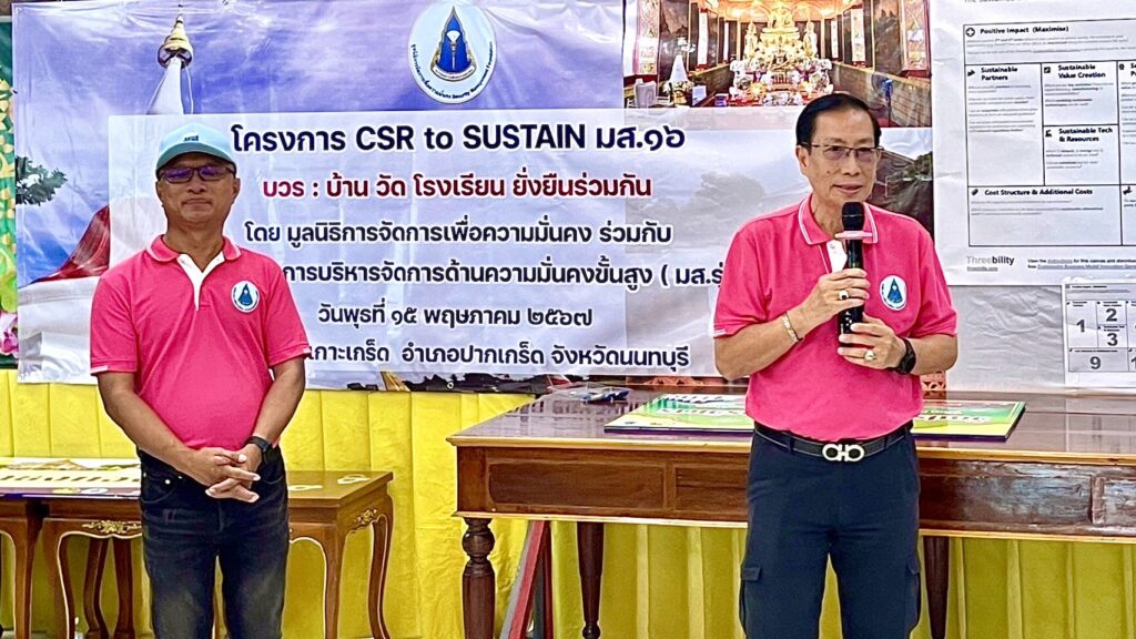 เมื่อวันที่ 15 พฤษภาคม 2567 ที่ห้องประชุมวัดปรมัยยิกาวาสวรวิหาร ต.เกาะเกร็ด อ.ปากเกร็ด จ.นนทบุรี : นายภิรมย์ ชุมนุม นายอําเภอปากเกร็ด จ.นนทบุรี พร้อมด้วย พระครูพิพิธเจติยาบาล เจ้าอาวาสวัดปรมัยยิกาวาสวรวิหาร ผู้ใหญ่บ้าน อบต.เกาะเกร็ด ผู้อํานวยการโรงเรียน คณะครูโรงเรียนวัดปรมัยยิกาวาส และประธานกลุ่มวิสาหกิจชุมชน ให้การต้อนรับ พล.อ.ดร.มารุต ปัชโชตะสิงห์ ผู้อํานวยการหลักสูตร มส.,พล.อ.ต.หญิง ผศ.ดร.พัชรี พิพิธสุขสันต์ รองผู้อํานวยการหลักสูตรฯ,ดร.วรวุฒิ ไชยศร ผู้ช่วยผู้อํานวยการหลักสูตรฯ พร้อมคณาจารย์ และนักศึกษาหลักสูตร การบริหารจัดการด้านความมั่นคงขั้นสูง (มส.รุ่นที่16) ในการทำกิจกรรม CSR TO SUSTAIN มส.16 สร้างผู้นำด้านความรับผิดชอบต่อสังคมที่ยั่งยืน บวร : บ้าน วัด โรงเรียน