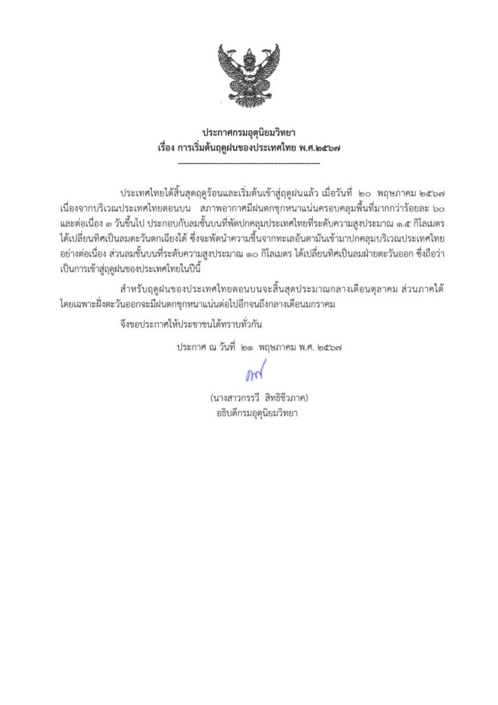 ประกาศกรมอุตุนิยมวิทยา เรื่อง การเริ่มต้นฤดูฝนของประเทศไทย พ.ศ.๒๕๖๗