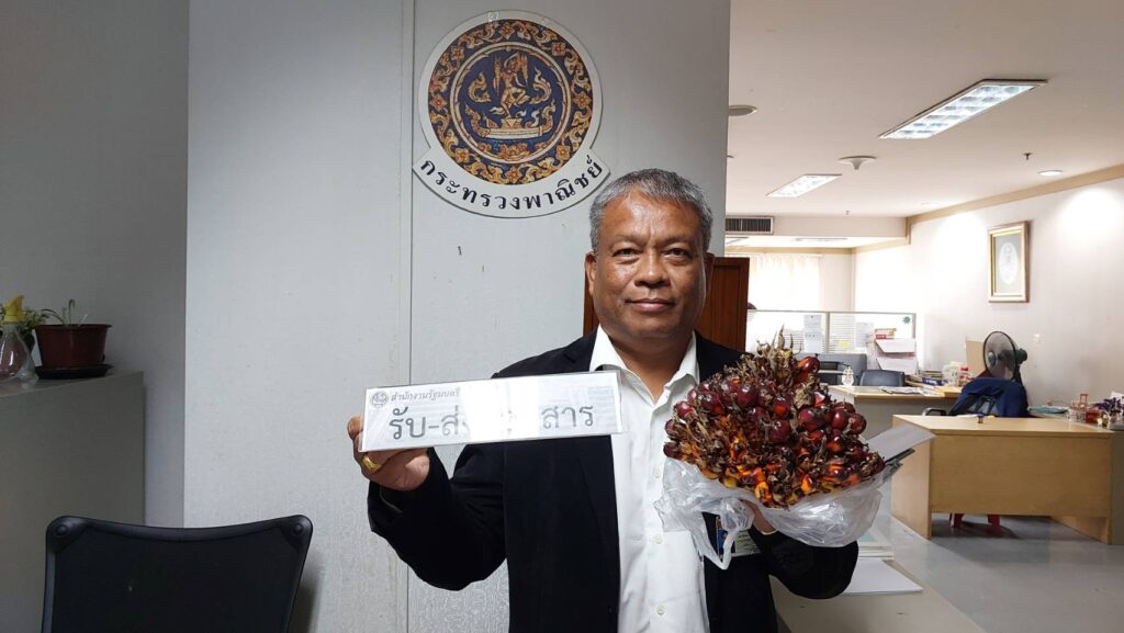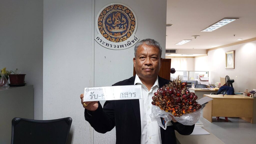 ๑. ขอให้ประกันราคาปาล์มในราคาที่เกษตรกรอยู่ได้ให้เหมาะสมกับราคาต้นทุนการผลิตของเกษตรกร (มีทะลายปาล์ม ๑ ทะลาย ชาวสวนฝากมาให้นายภูมิธรรมฯ รัฐมนตรี)