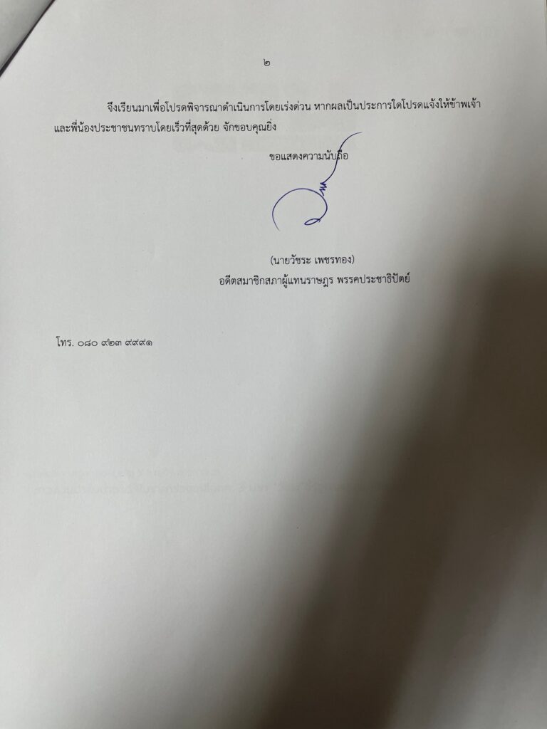 จึงเรียนมาเพื่อโปรดพิจารณาดำเนินการโดยเร่งด่วน หากผลเป็นประการใดโปรดแจ้งให้ข้าพเจ้าและพี่น้องประชาชนทราบโดยเร็วที่สุดด้วย จักขอบคุณยิ่ง