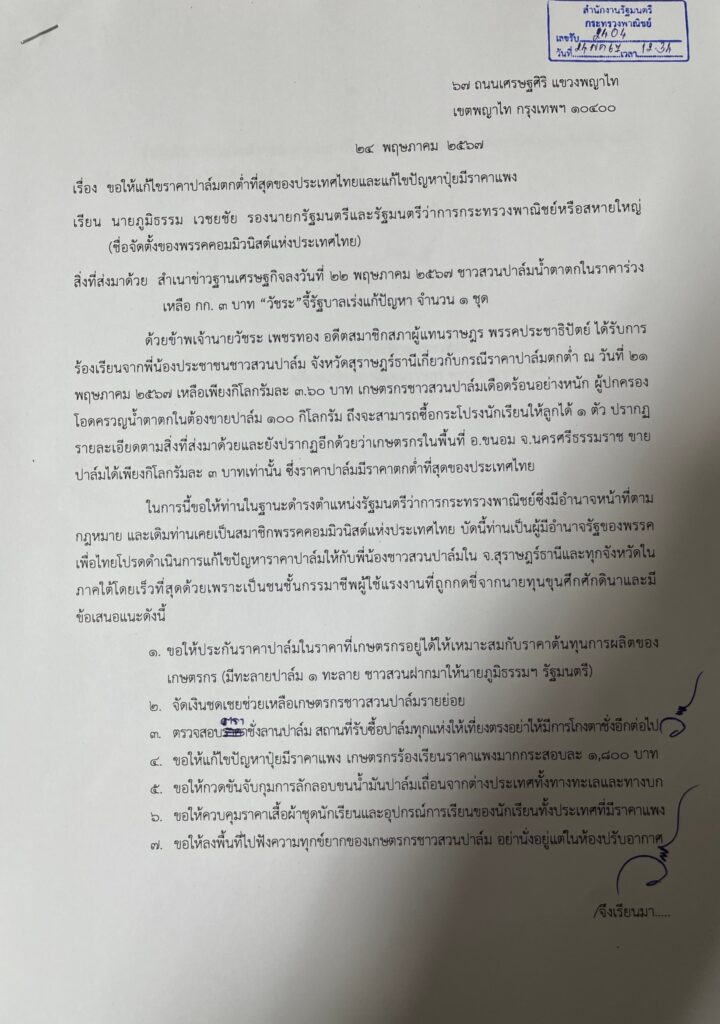 ในหนังสือระบุว่าด้วยข้าพเจ้านายวัชระ เพชรทอง อดีตสมาชิกสภาผู้แทนราษฎร พรรคประชาธิปัตย์ ได้รับการร้องเรียนจากพี่น้องประชาชนชาวสวนปาล์ม จังหวัดสุราษฎร์ธานีเกี่ยวกับกรณีราคาปาล์มตกต่ำ ณ วันที่ ๒๑ พฤษภาคม ๒๕๖๗ เหลือเพียงกิโลกรัมละ ๓.๖๐ บาท เกษตรกรชาวสวนปาล์มเดือดร้อนอย่างหนัก ผู้ปกครองโอดครวญน้ำตาตกในต้องขายปาล์ม ๑๐๐ กิโลกรัม ถึงจะสามารถซื้อกระโปรงนักเรียนให้ลูกได้ ๑ ตัว ปรากฏรายละเอียดตามสิ่งที่ส่งมาด้วยและยังปรากฏอีกด้วยว่าเกษตรกรในพื้นที่ อ.ขนอม จ.นครศรีธรรมราช ขายปาล์มได้เพียงกิโลกรัมละ ๓ บาทเท่านั้น ซึ่งราคาปาล์มมีราคาตกต่ำที่สุดของประเทศไทย