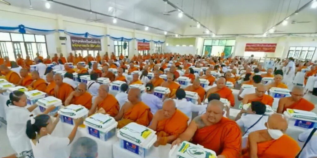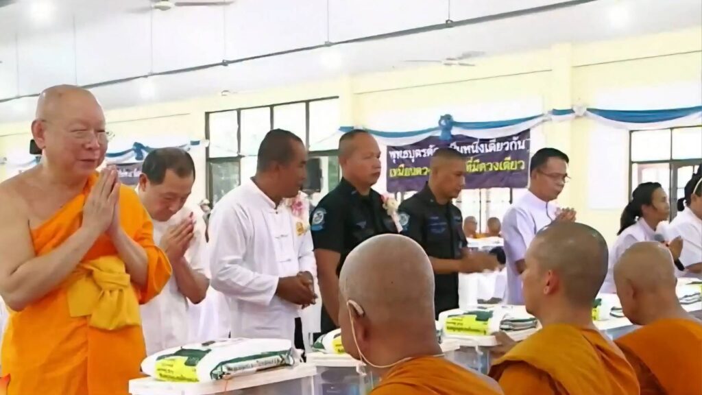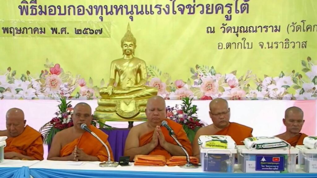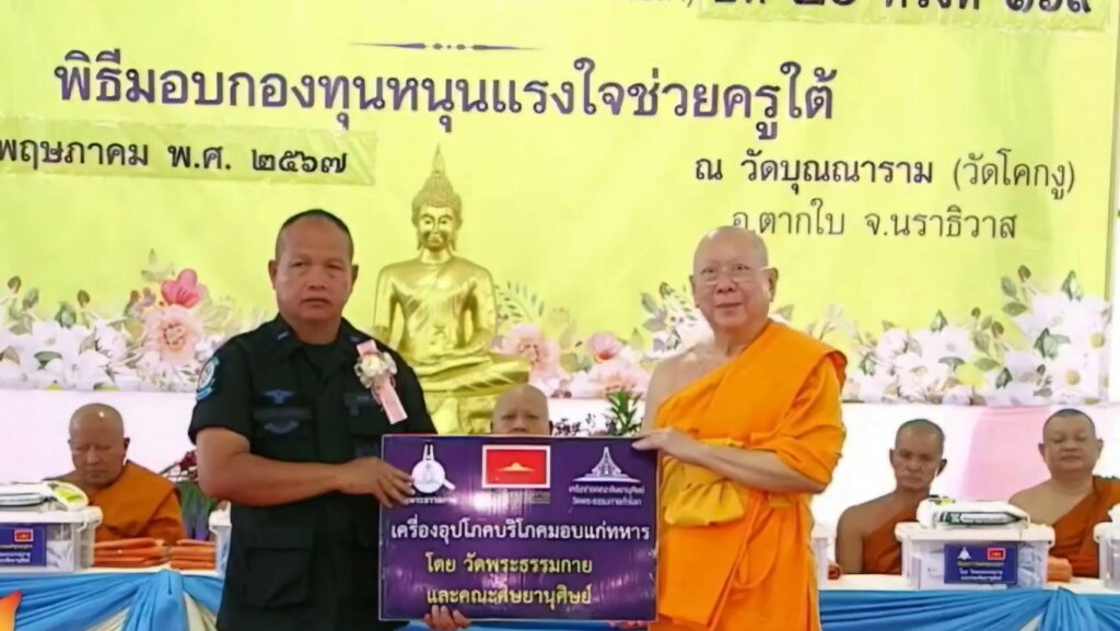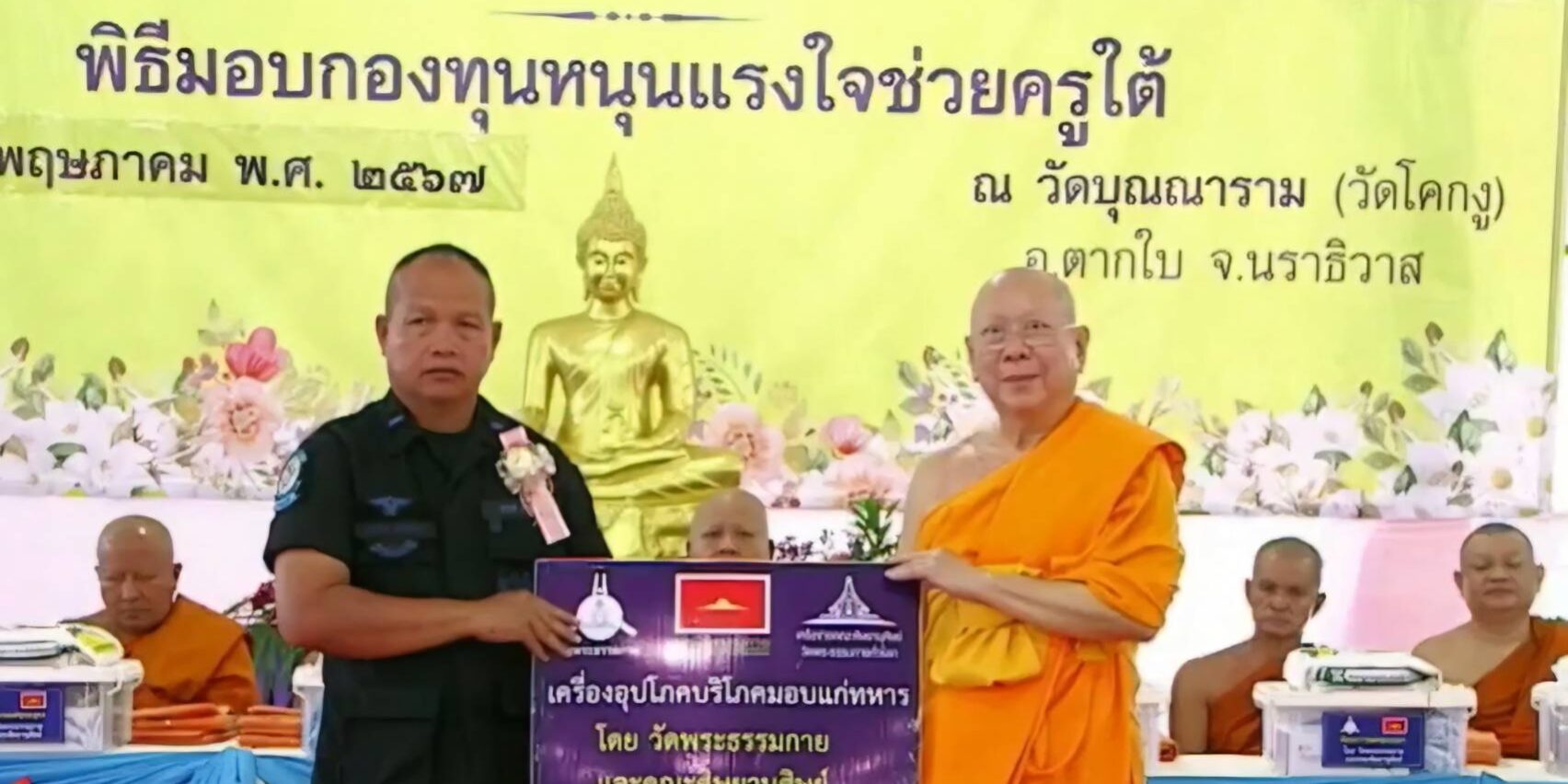 สำหรับพิธีถวายสังฆทานแด่คณะสงฆ์ 323 วัด 4 จังหวัดชายแดนภาคใต้ จัดขึ้นโดยวัดพระธรรมกาย มูลนิธิธรรมกาย ร่วมกับพุทธบริษัท วัตถุประสงค์เพื่อถวายเป็นพุทธบูชา รักษาแสงธรรมไม่ให้ดับสูญไปจากดินแดนภาคใต้ พร้อมกับสร้างขวัญและกำลังใจแก่พุทธศาสนิกชนในพื้นที่ให้เข้มแข็งขึ้น จัดครั้งแรกเมื่อวันที่ 7 มิถุนายน พ.ศ. 2548 ณ วัดมุจลินทวาปีวิหาร จังหวัดปัตตานี ปัจจุบันจัดติดต่อกันเป็นปีที่ 20 ครั้งที่ 169 และจัดอย่างต่อเนื่องจนกว่าเหตุการณ์จะสงบ ส่วนกองทุนหนุนแรงใจช่วยครูใต้ มอบแล้ว 40,000 กว่ากองทุน ข้าวสารอาหารแห้งมอบช่วยเหลือพระสงฆ์เจ้าหน้าที่ตำรวจ ทหาร ครู และประชาชน ในพื้นที่เสี่ยงภัยกว่า 6,000 ตัน.
