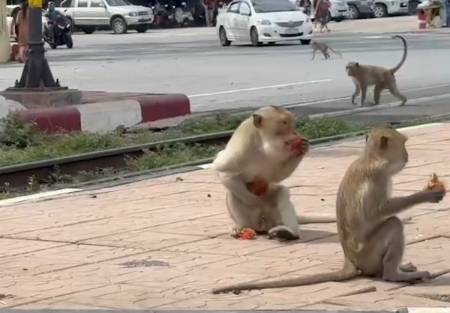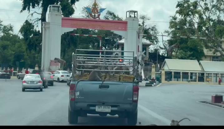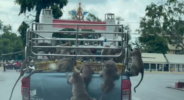 ขับมาจอดบริเวณด้านหน้าพระปรางค์สามยอดและได้จอดติดขบวนรถไปได้มีฝูงเจ้าจ๋อซึ่งเป็นลิงที่อาศัยอยู่บริเวณตึกจำนวนกว่า30-40ตัว ได้กระโดดขึ้นไปที่บริเวณท้ายกระบะที่บรรทุกส้มใส่ตะกร้ามาจำนวนหลายตะกร้าอยู่ที่บริเวณท้ายกระบะและได้รุมแย้งกันอย่างอลม่าน ทางเจ้าของรถได้แต่บีบแตรไล่ฝูงลิงที่กำลังแย่งส้มกันอยู่ท้ายกระบะรถของตัวเองแต่ไม่กล้าลงมาไล่เพราะคาดว่าน่าจะกลัวจะถูกฝูงลิงทำร้ายหากลงมาไล่มันที่กำลังแย้งส้มกันอยู่ แต่ยังโชคที่ที่ติดขบวนรถไฟไม่นานแค่เวลาไม่ถึง2นาทีก็ผ่านจุดทางรถไฟไปได้ ทำให้ส้มที่จะนำไปขายเสียหายจากฝูงลิงกลุ่มนี้ไม่มากเท่าไร