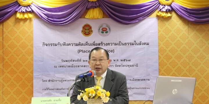 เมื่อวันที่ 23 พ.ค.67 เวลา 09.00 น.ที่ เทศบาลเมืองลาดสวาย อำเภอลำลูกกา จังหวัดปทุมธานี นายคมสัน ญาณวัฒนา รองผู้ว่าราชการจังหวัดปทุมธานี เป็นผู้แทนกล่าวต้อนรับนายทรงศัก สายเชื้อ ผู้ตรวจการแผ่นดิน ในโอกาสเป็นประธานเปิดกิจกรรมรับฟังความคิดเห็นเพื่อสร้างความเป็นธรรมในสังคม (Place of Justice) ภายใต้โครงการส่งเสริมการมีส่วนรวมของทุกภาคส่วนในการแก้ไขความเดือดร้อนหรือความไม่เป็นธรรมแก่ประชาชน ประจำปีงบประมาณ พ.ศ.2567 ของสำนักงานตรวจเงินแผ่นดิน โดยมี หม่อมหลวงปุณฑริก สมิติ ที่ปรึกษาผู้ตรวจการแผ่นดิน นางสาวรอยพิมพ์ ถีระวงษ์ ผู้เชี่ยวชาญประจำผู้ตรวจการแผ่นดิน นายทิฆัมพร ยะลา รองเลขาธิการสำนักงานผู้ตรวจการแผ่นดิน หัวหน้าส่วนราชการ องค์กรปกครองส่วนท้องถิ่น และประชาชนจังหวัดปทุมธานี จำนวน 120 คน เข้าร่วมกิจกรรม